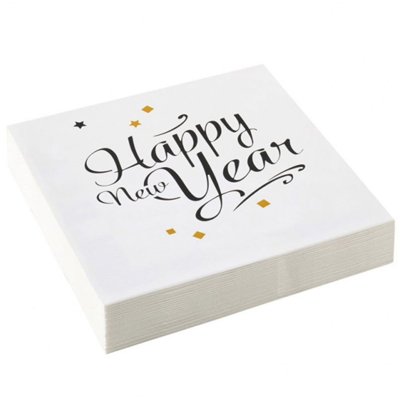 Nyårs Servetter Happy New Year omfattar ett 20-pack vita servetter med svart "Happy New Year" text. Servetterna har tre lager och mäter ca 33 x 33 cm utvikta.