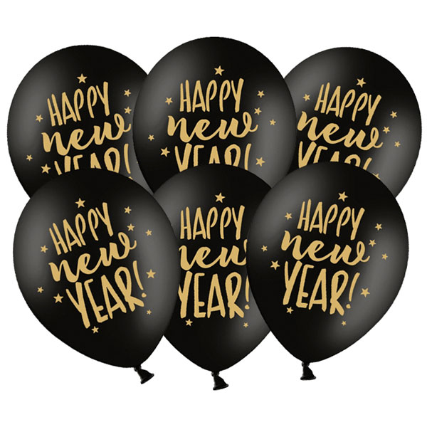 Nyårsballonger Svart och Guld omfattar 6 stycken svarta latexballonger med guldig "Happy New Year" text samt små guldiga stjärnor. Ballongerna fylls med luft eller helium och blir ca 30 cm stora.