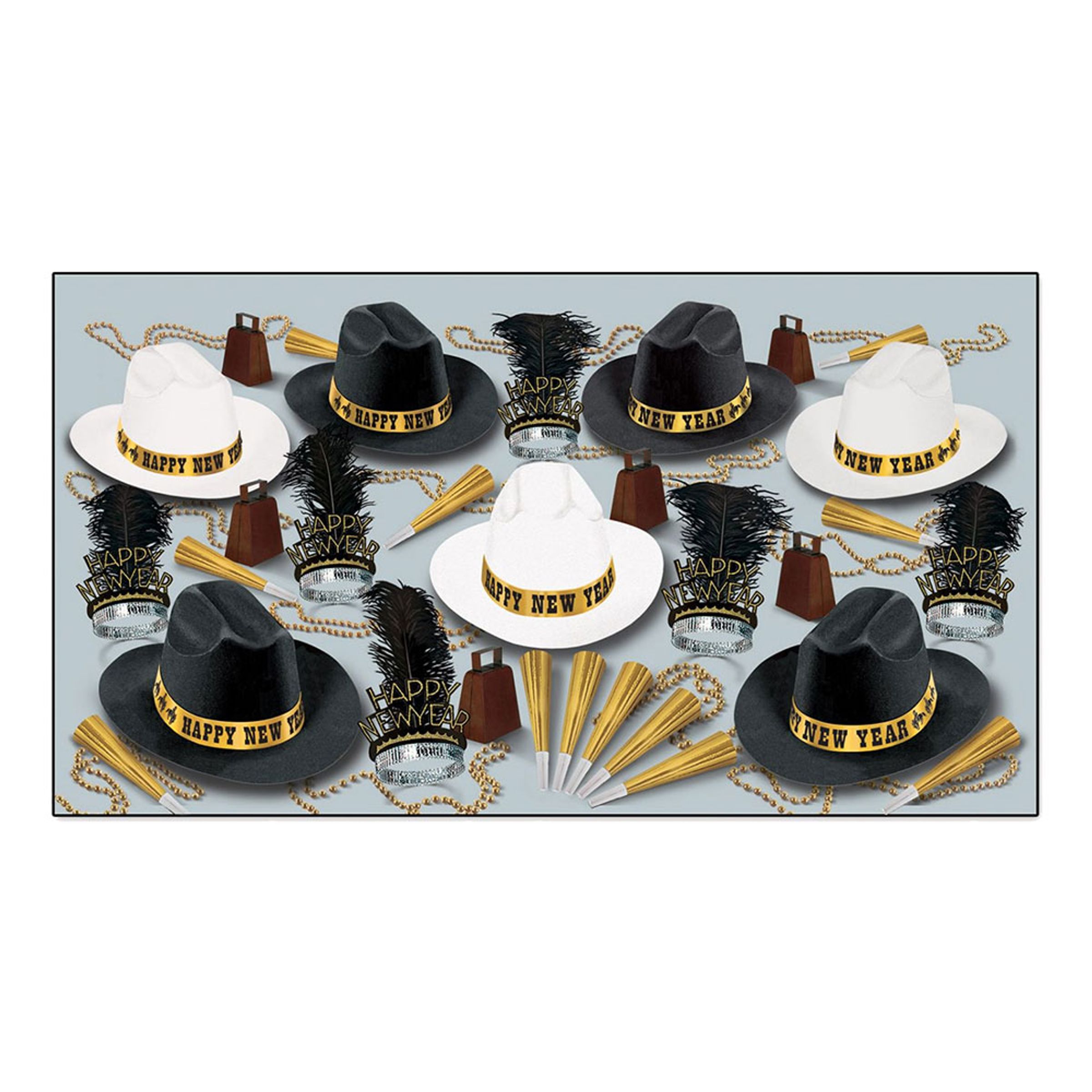 Nyårskit Happy New Year Western är ett komplett nyårskit för upptill 50 personer som innehåller: 25 st enkla cowboyhattar, 25 st tiaror med fjädrar, 10 st kobjällror, 40 st blåshorn och 25 st guldfärgade partybeads-halsband.