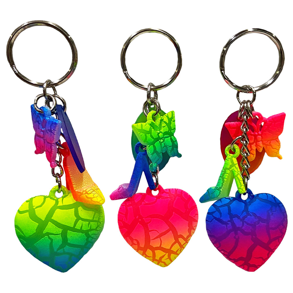 Nyckelring Regnbåge Hjärta omfattar en nyckelring i form av ett hjärta, en fjäril och en högklackad sko i starka färger. Nyckelringen finns i färgerna blå/grön, rosa/blå eller gul/rosa, vilken du får blir en överraskning.