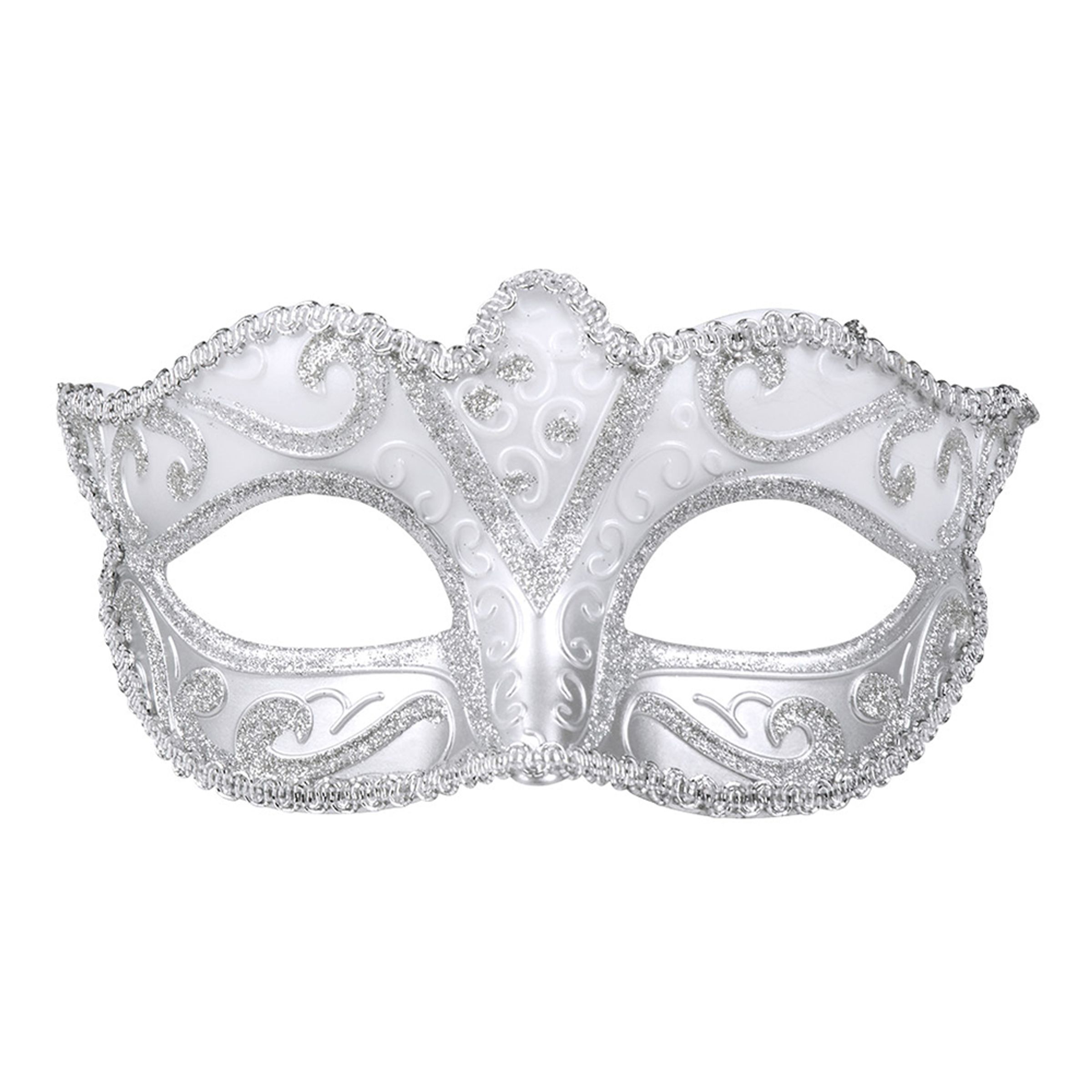 Ögonmask Venice Silver levereras styckvis, kommer i storleken One size för vuxna och är tillverkad i plast och polyester. Hål för ögonen finns. Masken fästs med knytband gjort av tyg.