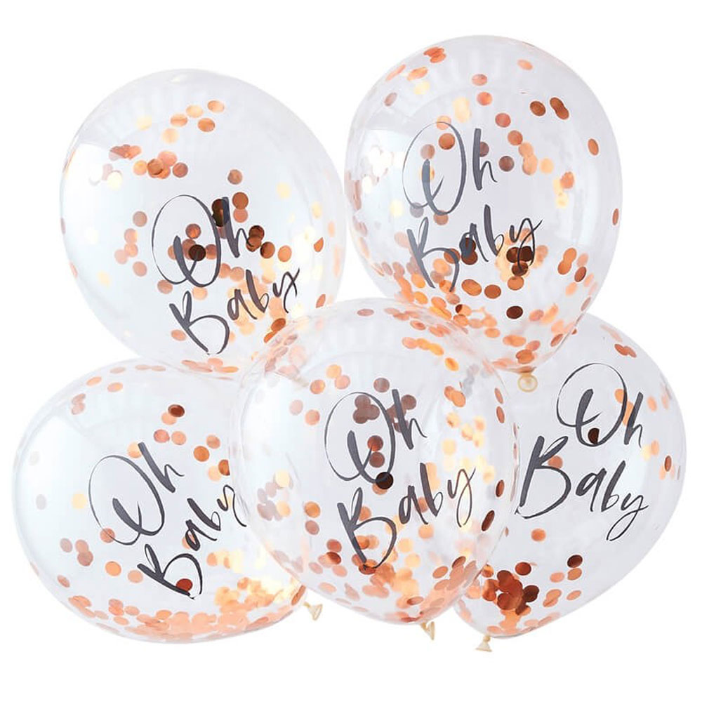 Oh Baby Konfettiballonger Roséguld består av 5 stycken genomskinliga ballonger med texten "Oh Baby" framtill, samt konfetti i roséguld. Blås upp latexballongen med luft eller helium.