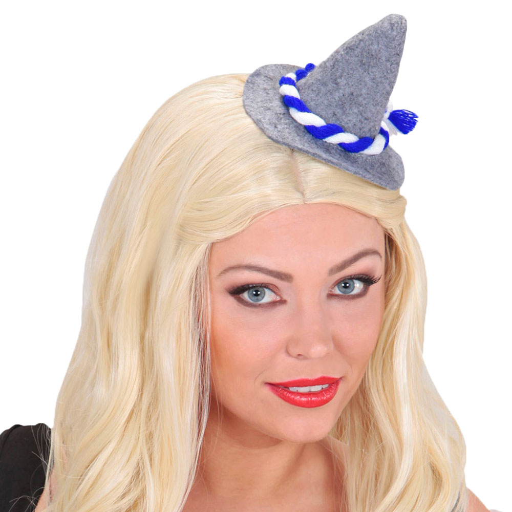Oktoberfest Diadem med Spetsig Hatt omfattar ett diadem med en grå mini-oktoberfest hatt i spetsig design. Hatten pryds av ett blått-vitt snöre och passar vuxna.