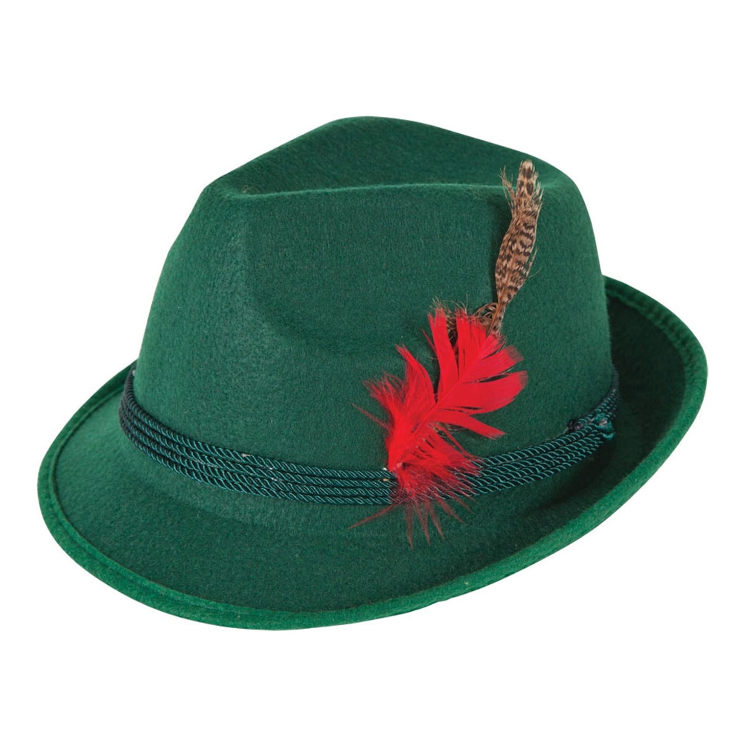 Oktoberfest Hatt kommer i grön färg med matchande band och fjädrar. (OBS! Det kan förekomma att bandet är vit/röd-randigt)
