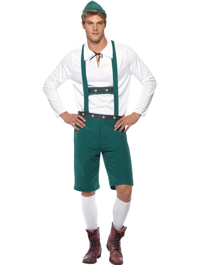 Oktoberfest Lederhosen Dräkt inkluderar en långärmad, vit topp med snörning runt halsen, ett par gröna lederhosen med fina detaljer, samt en matchande tyrolerhatt.