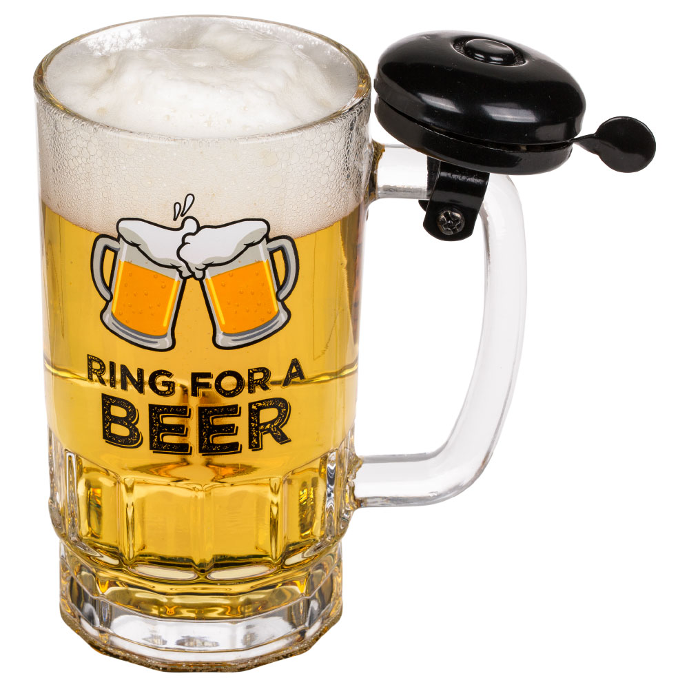 Ölglas med Ringklocka består av ett ölglas med en ringklocka på handtaget. Glaset har en bild av två skålande ölglas och texten "Ring for a beer". Ölglaset är ca 15 cm högt och har en diameter på 8,5 cm, samt rymmer 500 ml. Endast handdisk.