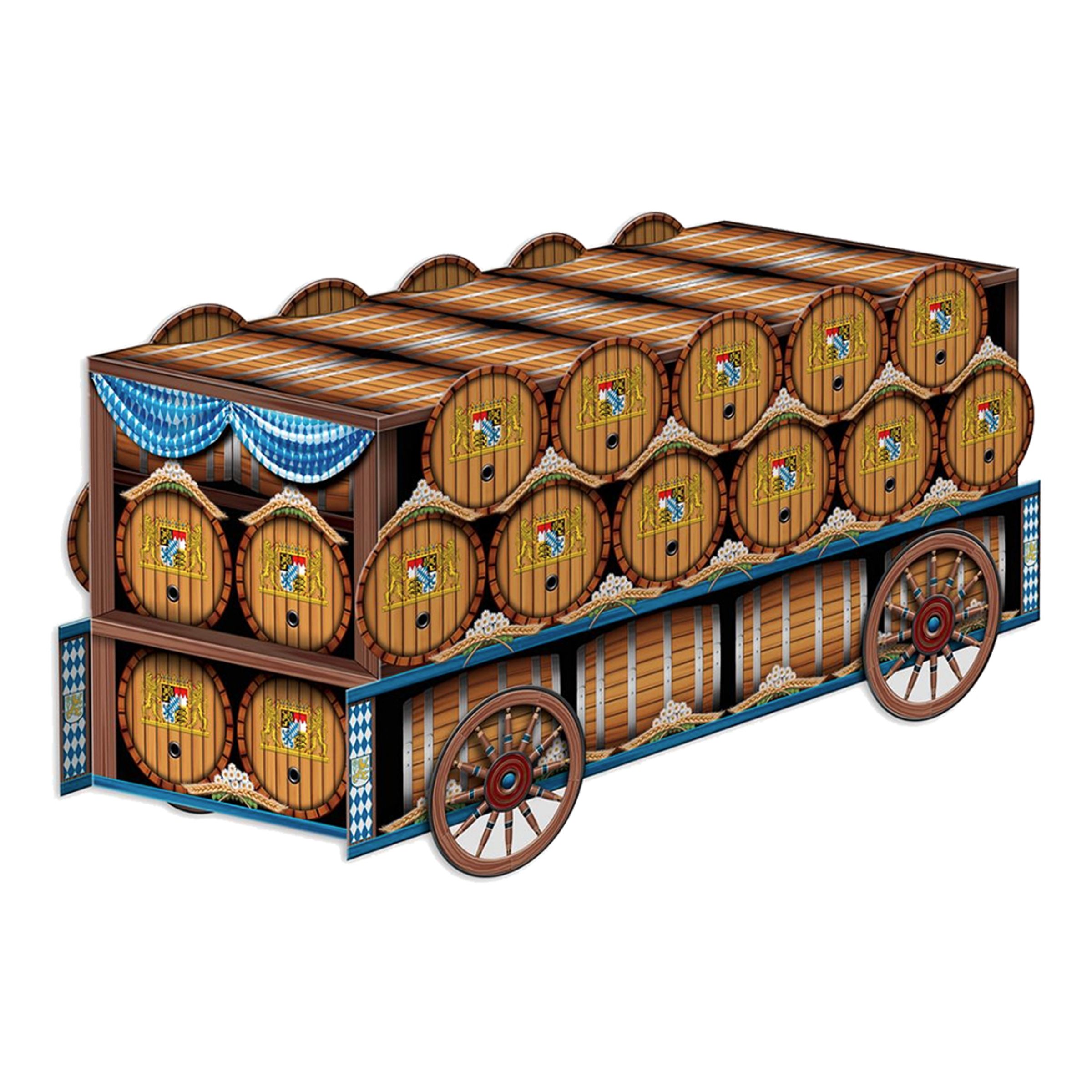 Ölvagn 3D Bordsdekoration är en bordsdekoration med formen av just en ölvagn full av klassiska bayerska symboler och öltunnor i 3D. Tack vare det läckra trycket och detaljrikedomen kommer den garanterat att vara ett uppskattat inslag i dukningen till festen.