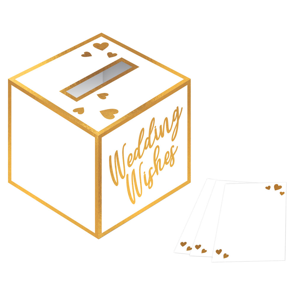 Önskelåda med Kort Bröllop omfattar en box i vit papp med motiv av guldhjärtan och texten "Wedding wishes". Med lådan kommer 40 stycken vita kort med guldhjärtan att skriva på. Boxen har ett hål på toppen där korten läggs i. Lådan är ca 25 cm stor och korten är ca 15 cm långa och 10,5 cm breda.