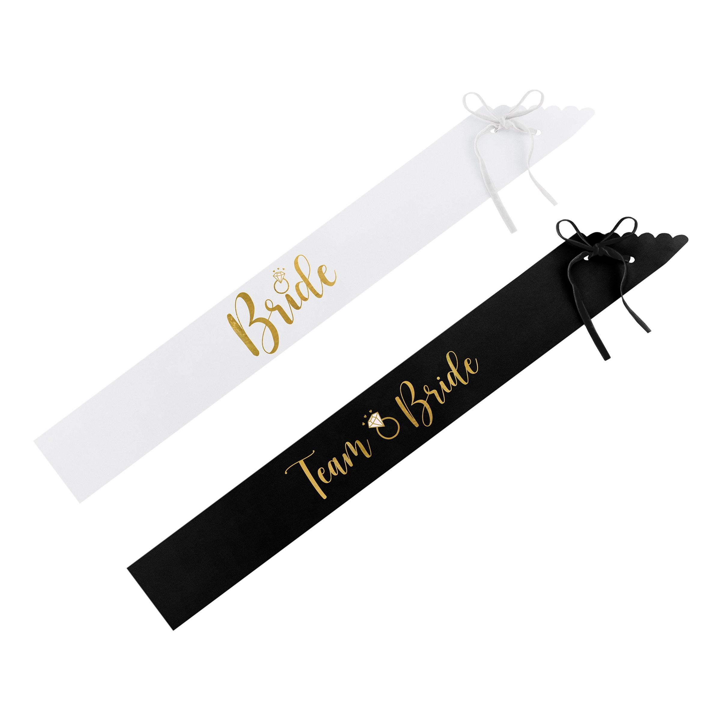 Ordensband Bride & Bride Squad Svart/Vit inkluderar sex stycken ordensband som kommer i två olika motiv: svarta med texten "Team Bride", samt ett vitt med texten "Bride". Perfekt för att utmärka kompisgänget på möhippan!