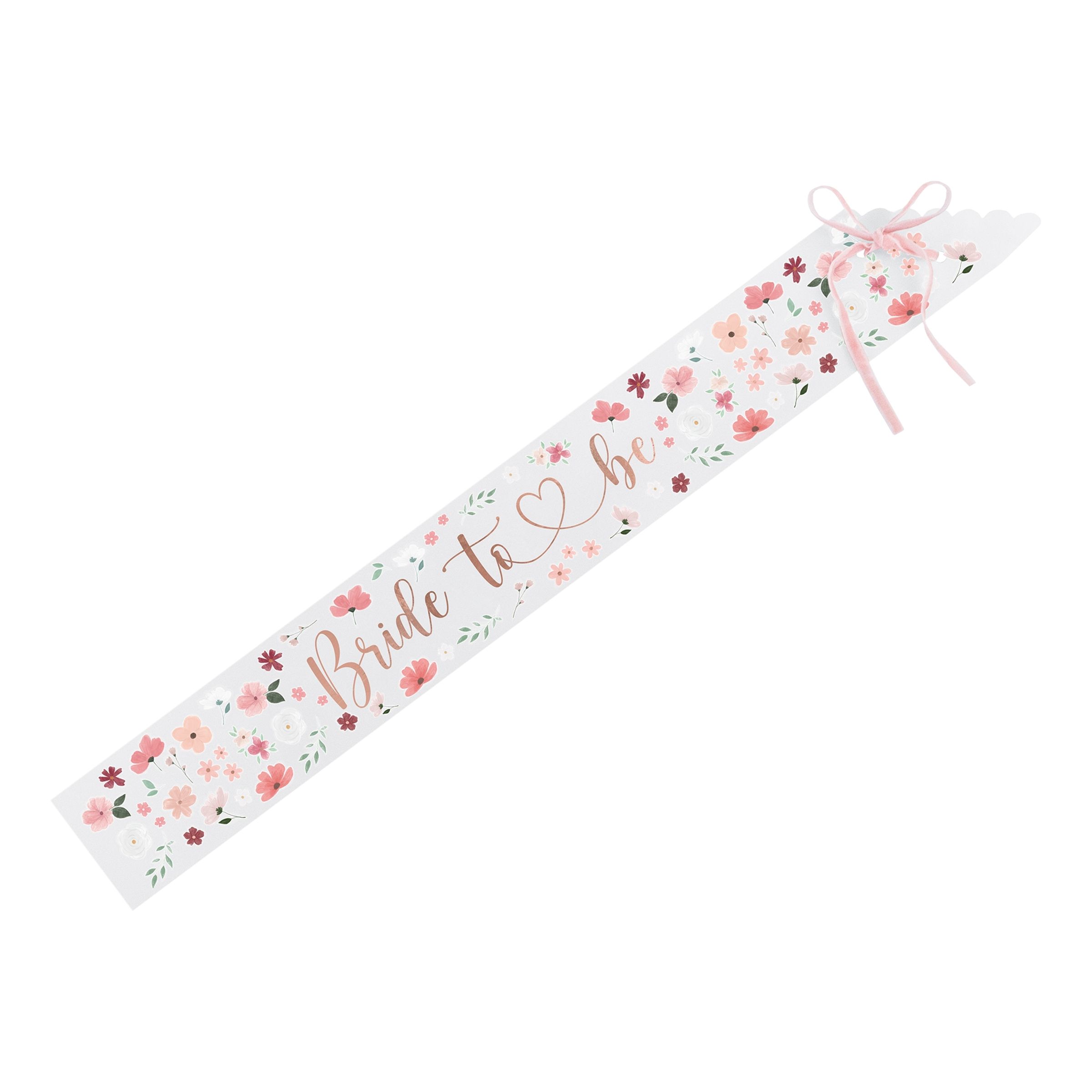 Ordensband Bride To Be Blommor mäter 9,5 cm bred och är tillverkad av papper. På bandet står det "Bride to be" och kommer göra den blivande bruden lite extra vacker på möhippan!
