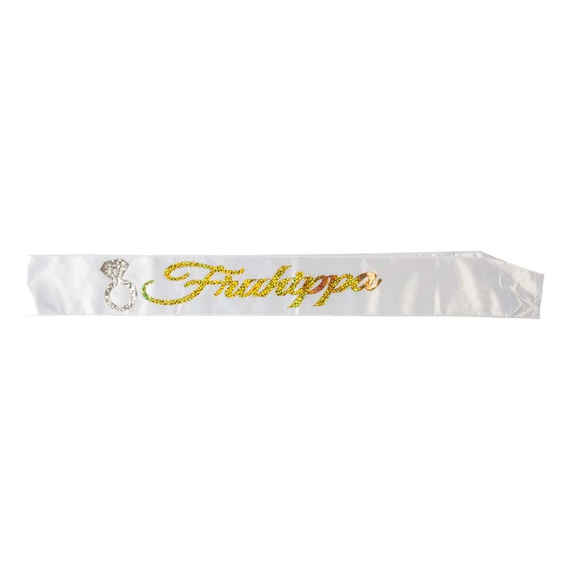 Ordensband Fruhippa är ett vitt, skimrande ordensband tryckt med "Fruhippa" i guldgrittrande utförande tillsammans med en silverglittrande diamantring. Passar lika bra till bröllopet som till möhippan. Tjusig och festlig som få!
