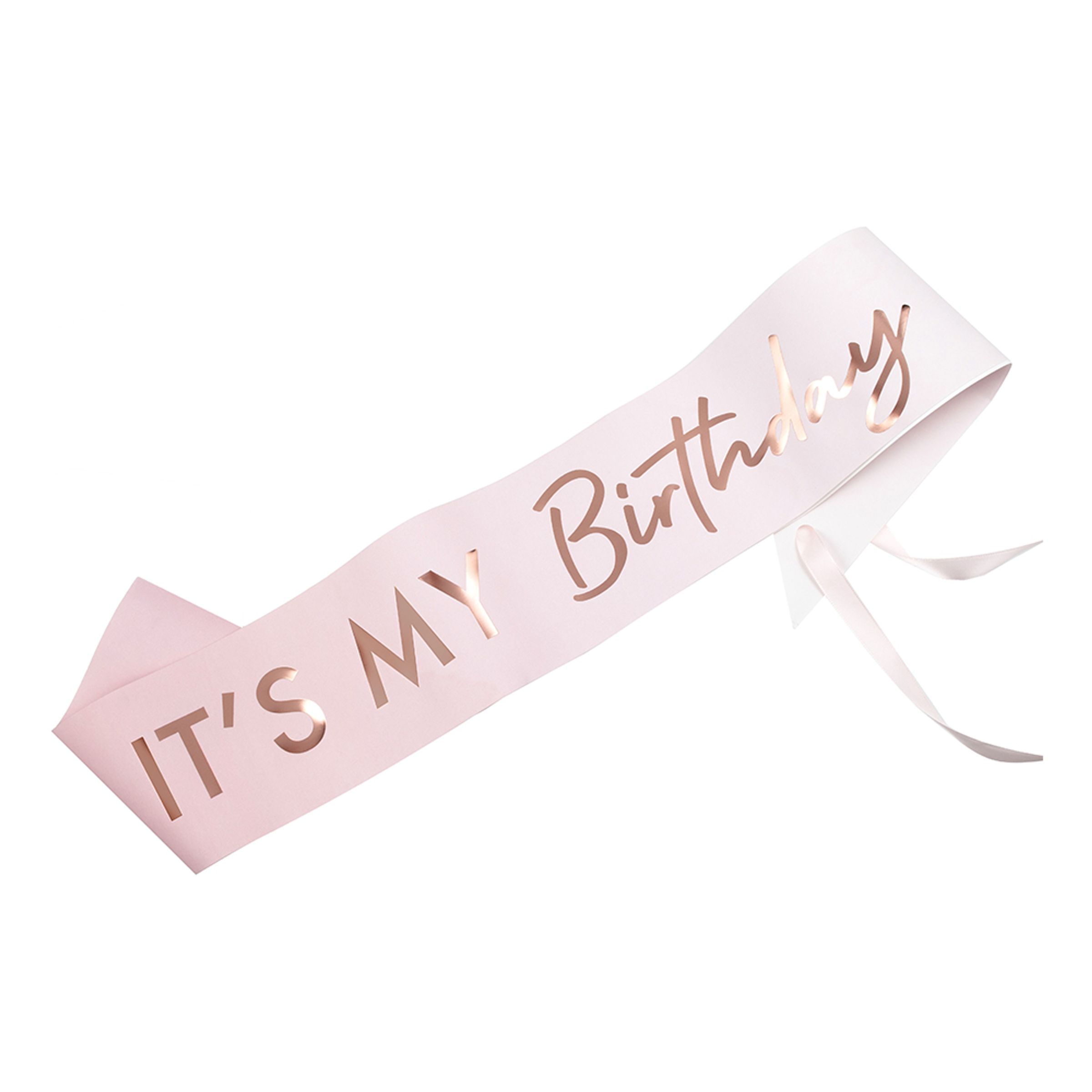 Ordensband It's My Birthday Roséguld/Rosa är ett rosa band med roséguldfärgad text där det står "It´s my birthday". Bandet kommer i en storlek och det är 75 x 10 cm stort. Bandet knyts fast på ryggen med hjälp av ett snöre. Det är tillverkat i polyester och papp.