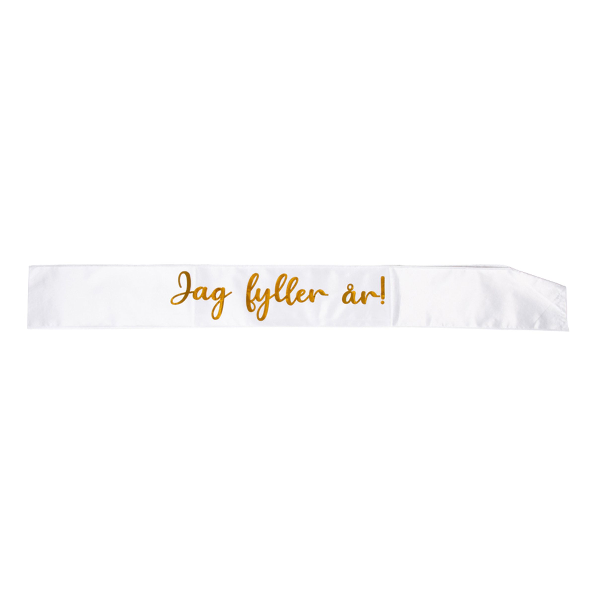 Ordensband Jag Fyller År! är ett vitt ordensband som kommer med texten "Jag fyller år!" skrivit i guld. Bandet är tillverkat i tygmaterial och hängs med fördel över födelsedagsbarnets axel som en rolig detalj på födelsedagskalaset.