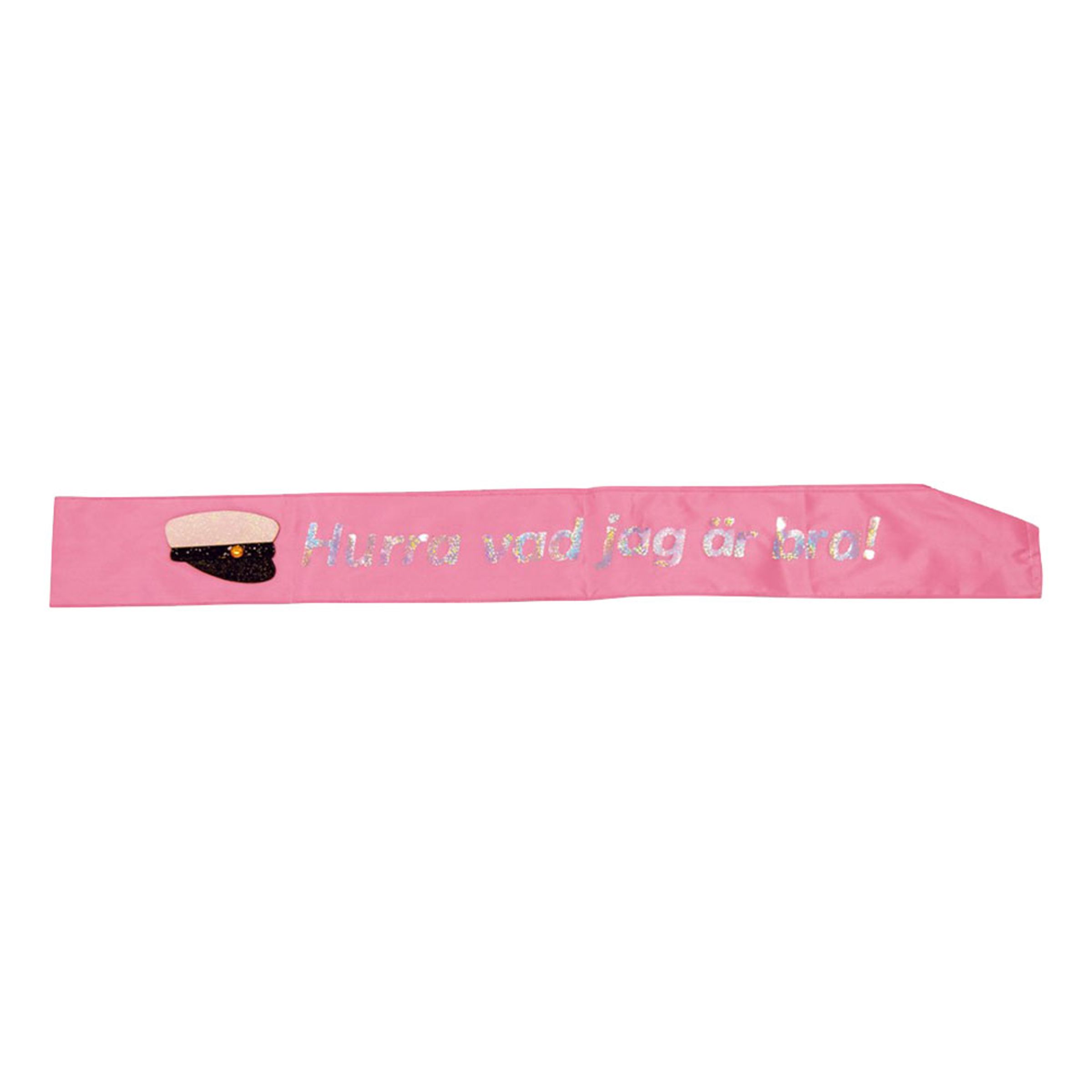 Ordensband Student Hurra Vad Jag Är Bra är ett rosa ordensband med en studentmössa på. På banden står det "Hurra vad bra jag är". Bandet är enkelt att hänga över axlarna. Det är tillverkat i polyester och är 78 x 9 cm stor. Det passar vuxna.