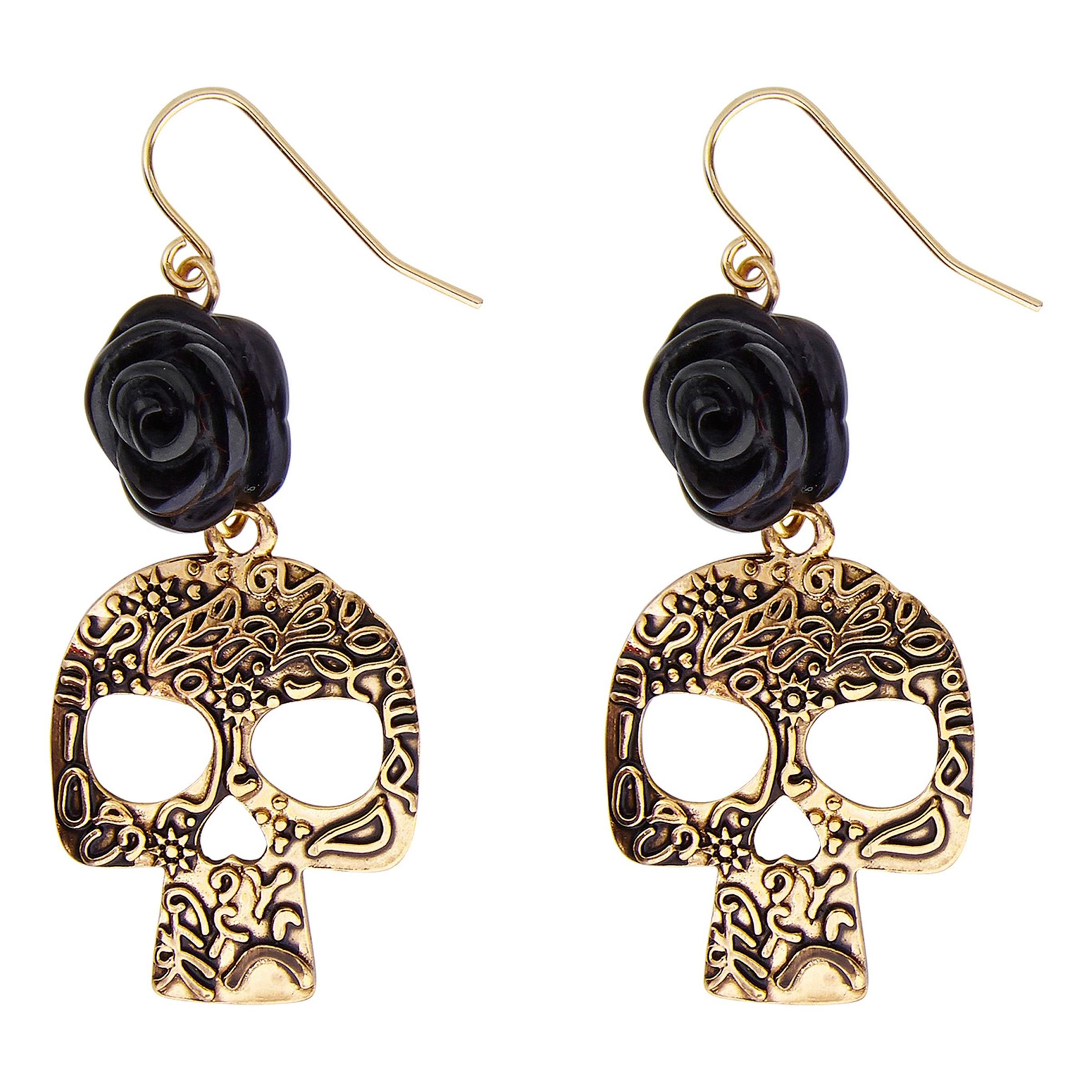 Örhängen Day of the Dead inkluderar två stycken örhängen med motiv av dödskallar och en svart ros. Passar lika bra till Halloweenfesten som till Day of the Dead firandet!