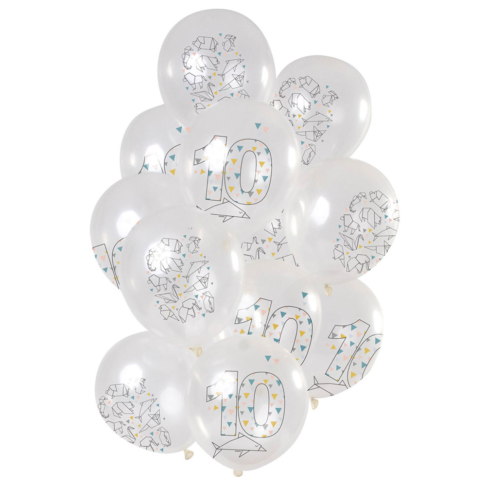 Origami 10-års Ballonger omfattar 12 stycken genomskinliga ballonger med motiv av origamidjur, små färgglada trianglar samt siffran 10.