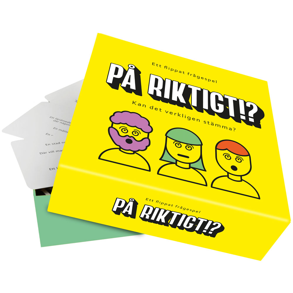Sätt en tempo- och spänningsfylld stämning vid hemmakvällen, middagen eller under något annat tillfälle med frågespelet "På Riktigt!?". Sant eller falskt? Svara rätt och svara snabbt för att kamma hem vinsten bland kamraterna.