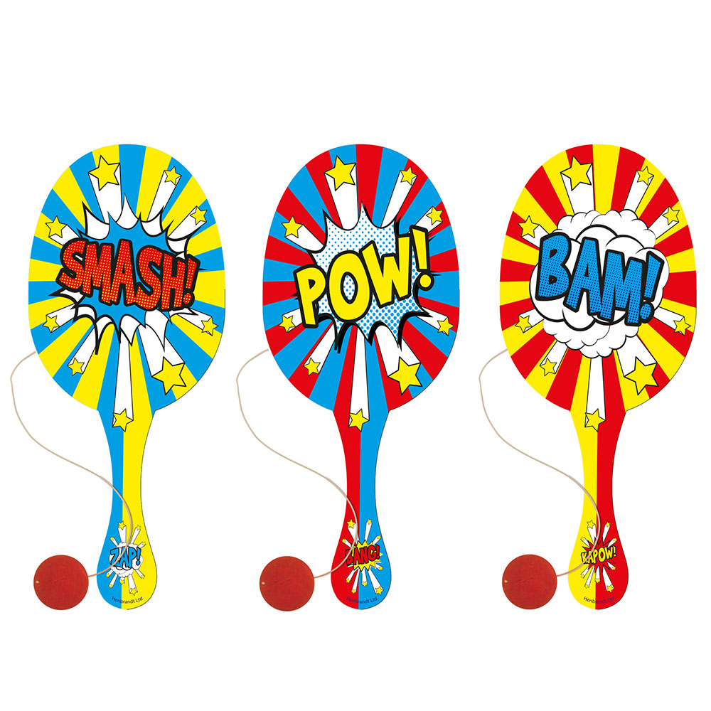 Paddle Balls Comic omfattar en racket med en röd boll med vitt snöre. Racketen finns i tre olika färgkombinationer och texter: röd/blå med texten "POW!", gul/röd med texten "BAM!" och gul/blå med texten "SMASH!".