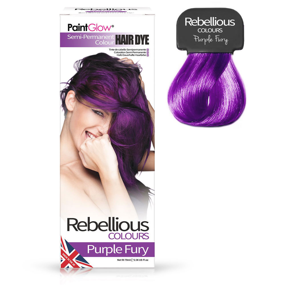 PaintGlow Semi-Permanent Hårfärg Purple Fury är en skonsam, semi permanent hårfärg som är helt fri från ammoniak och peroxid. Purple Fury är en lila nyans som håller i cirka 10 tvättar. Smörj in nacke och panna med en fet kräm för att undvika fläckar.