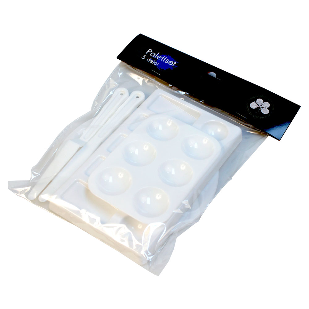 Palettset omfattar ett set med tre olika målarpaletter och två olika palettknivar. Paletterna och knivarna är tillverkade av plast och passar till flera olika typer av färger.