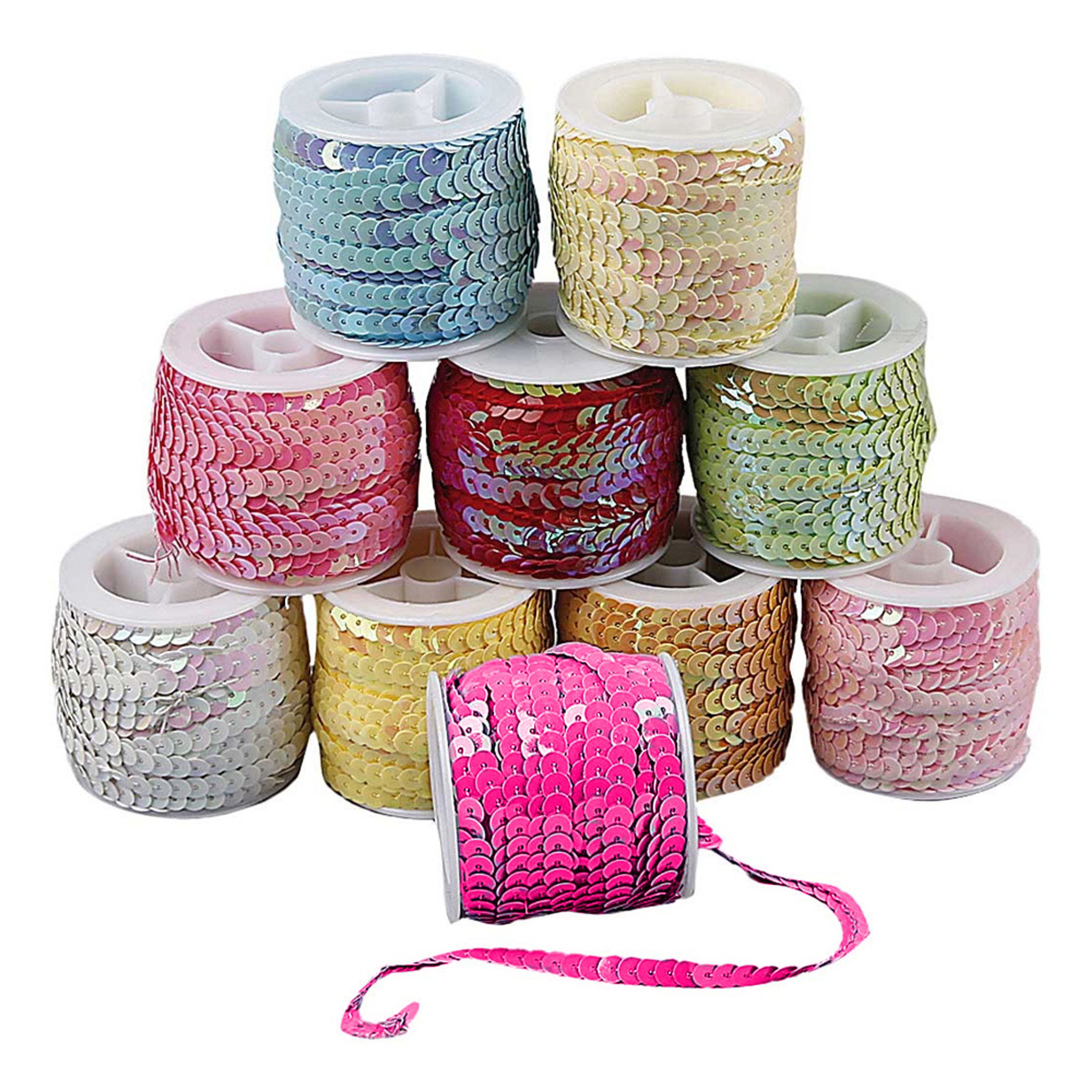 Paljettband Pärlemor finns i flera olika färger: Beige, gul, lila, ljusblå, ljusgrön, ljusrosa, orange, rosa, röd och vit. Paljettbandet mäter 6 mm bred och är 10 meter långt.