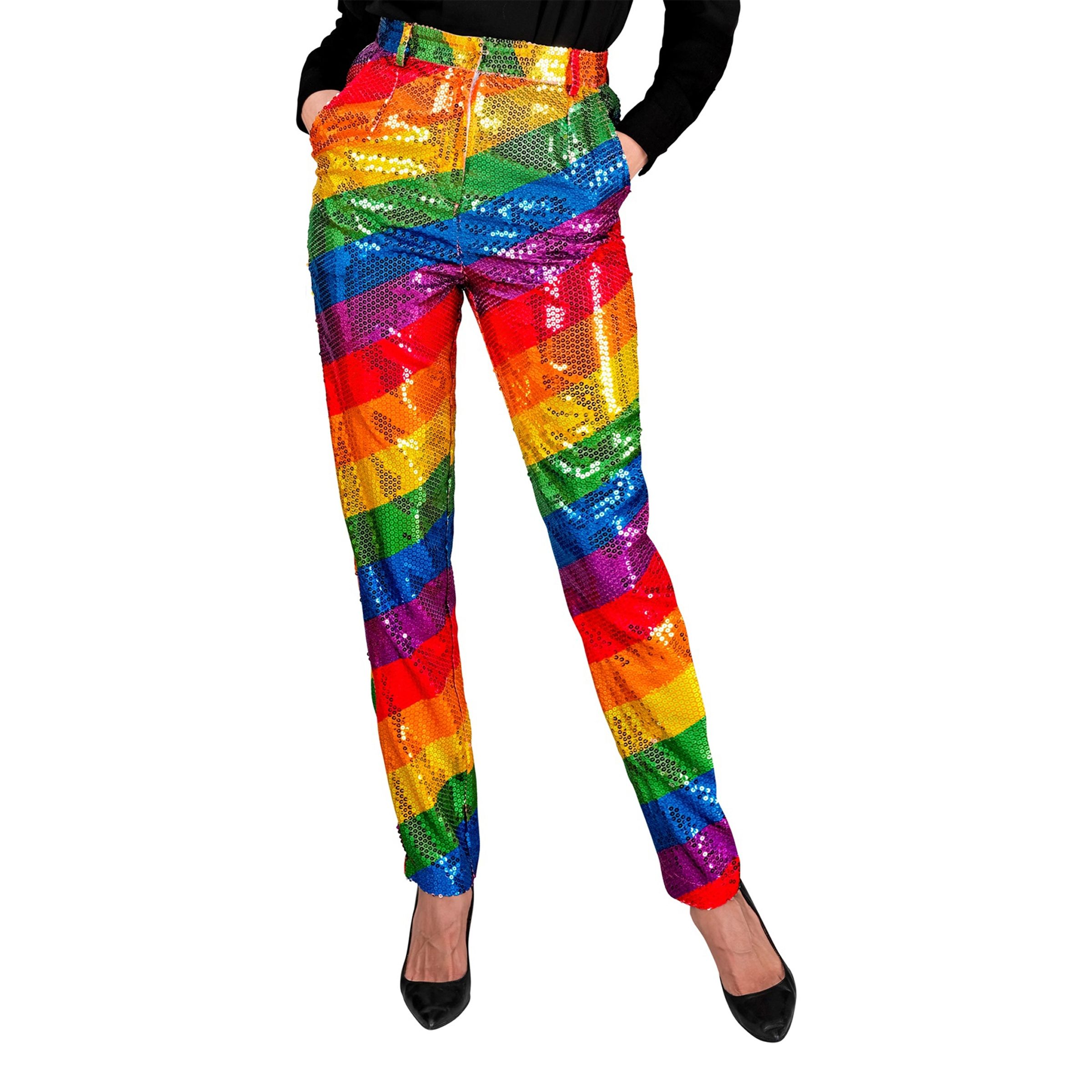 Paljettbyxor Dam Flerfärgade är ett par helfestliga byxor som kommer täckta i paljetter som skimrar i regnbågens färger. Byxorna passar perfekt att använda när du är bjuden på pridefest eller planerar att dyka upp på maskeraden klädd som en regnbåge från topp till tå.