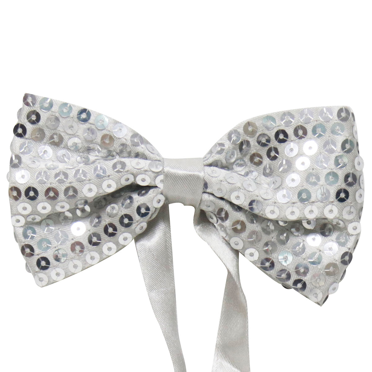Paljettfluga Silver omfattar en vit fluga med silvriga paljetter och ett vitt justerbart band.