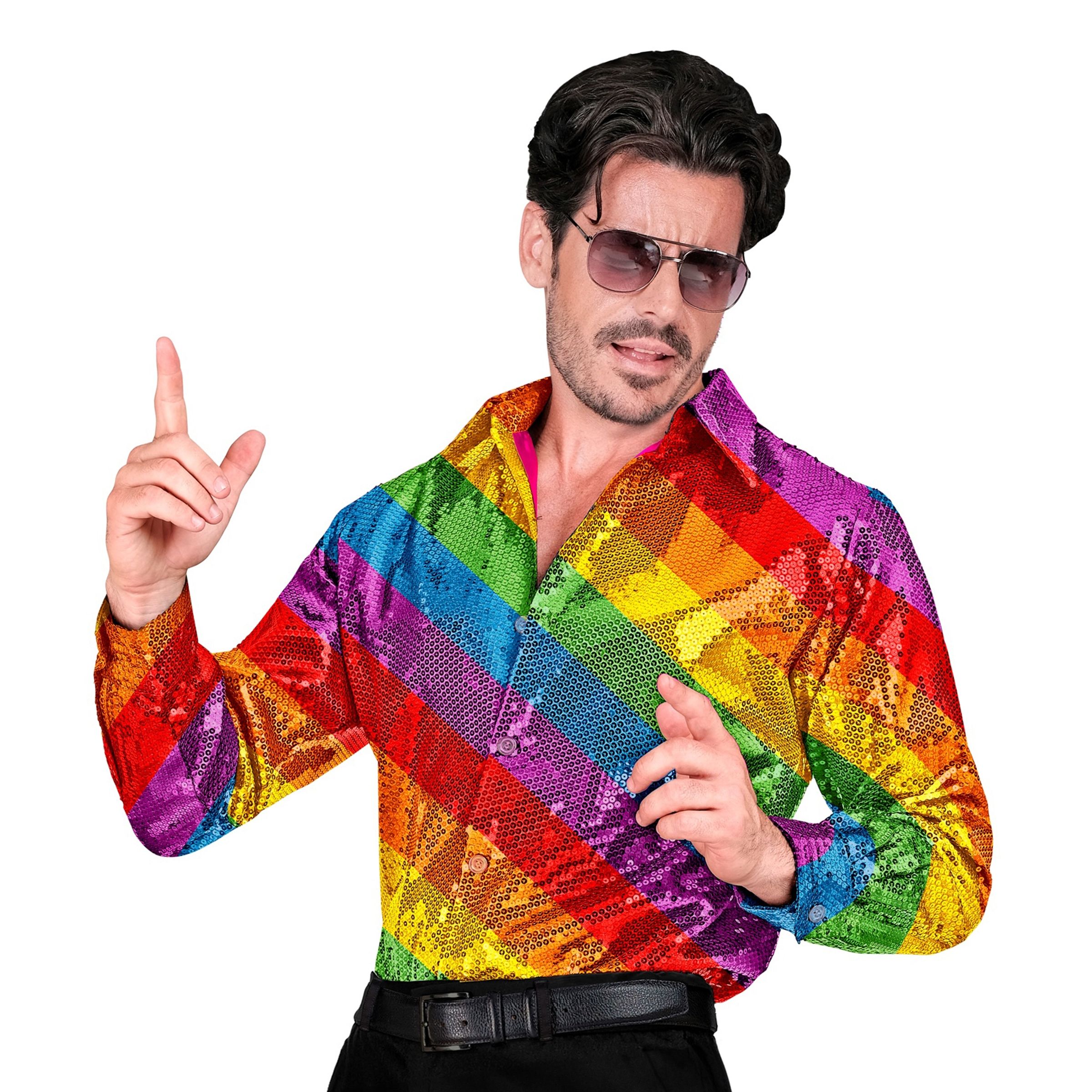Paljettskjorta Herr Flerfärgad är en helfestlig skjorta som kommer täckt i paljetter som skimrar i glimmande regnbågsfärger. Perfekt att använda när du ska på pridefest, maskeradfest eller planerar att dyka upp på schlagerfesten klädd som en discokille från topp till tå!