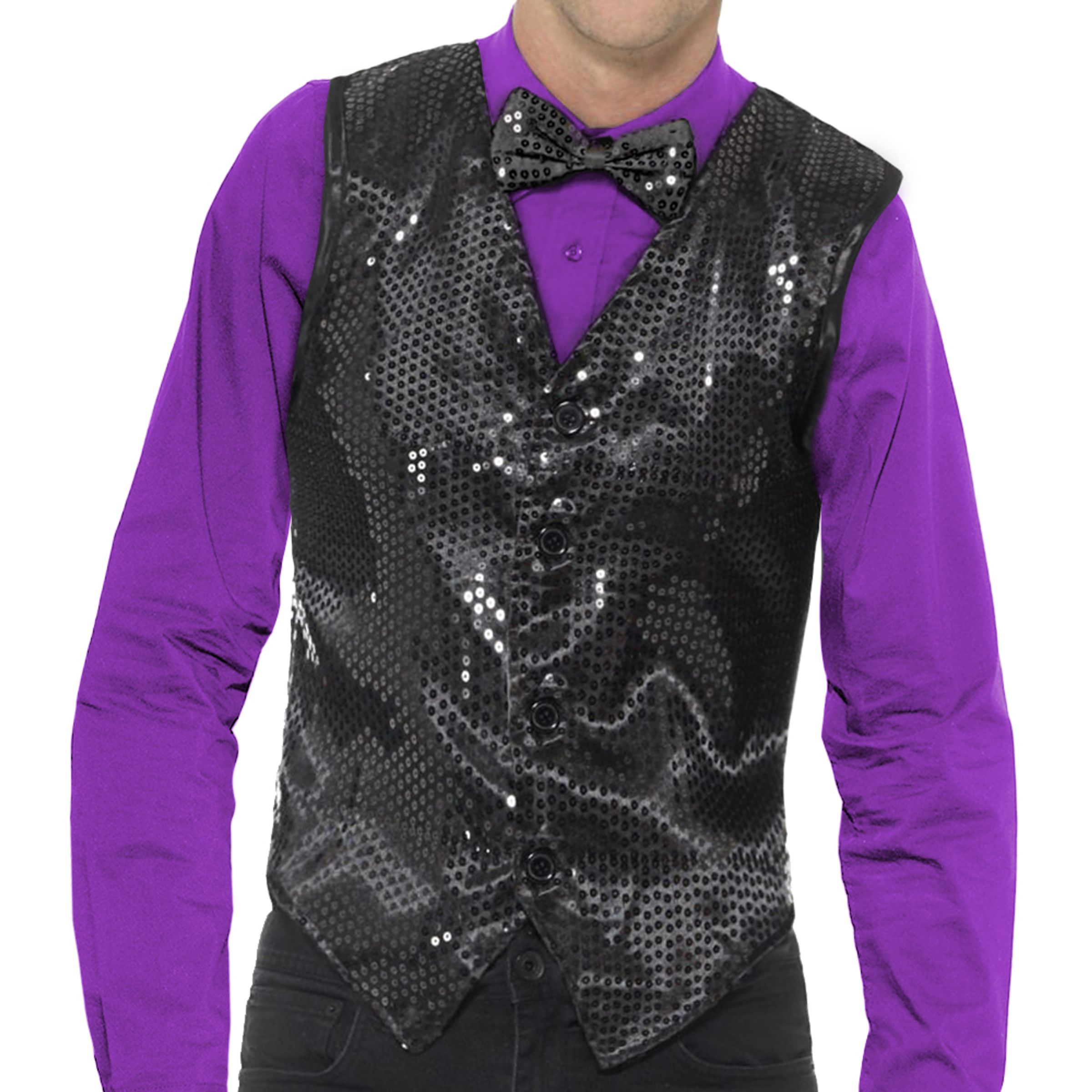Paljettväst Svart är en svart väst med paljetter för killar. Västen finns i fyra storlekar. Den är tillverkad i polyester och tål endast handtvätt. Det är bara västen som ingår, inget annat på bilden.