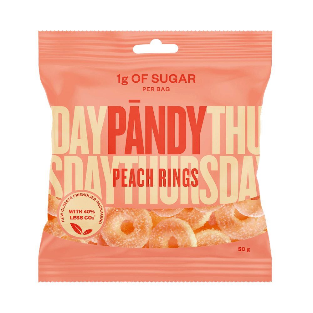 Peach Rings – Pändys första godis som kombinerar både skum och gelé. De möts och skapar godisringar i den perfekta konsistensen med en smak av söt persika.