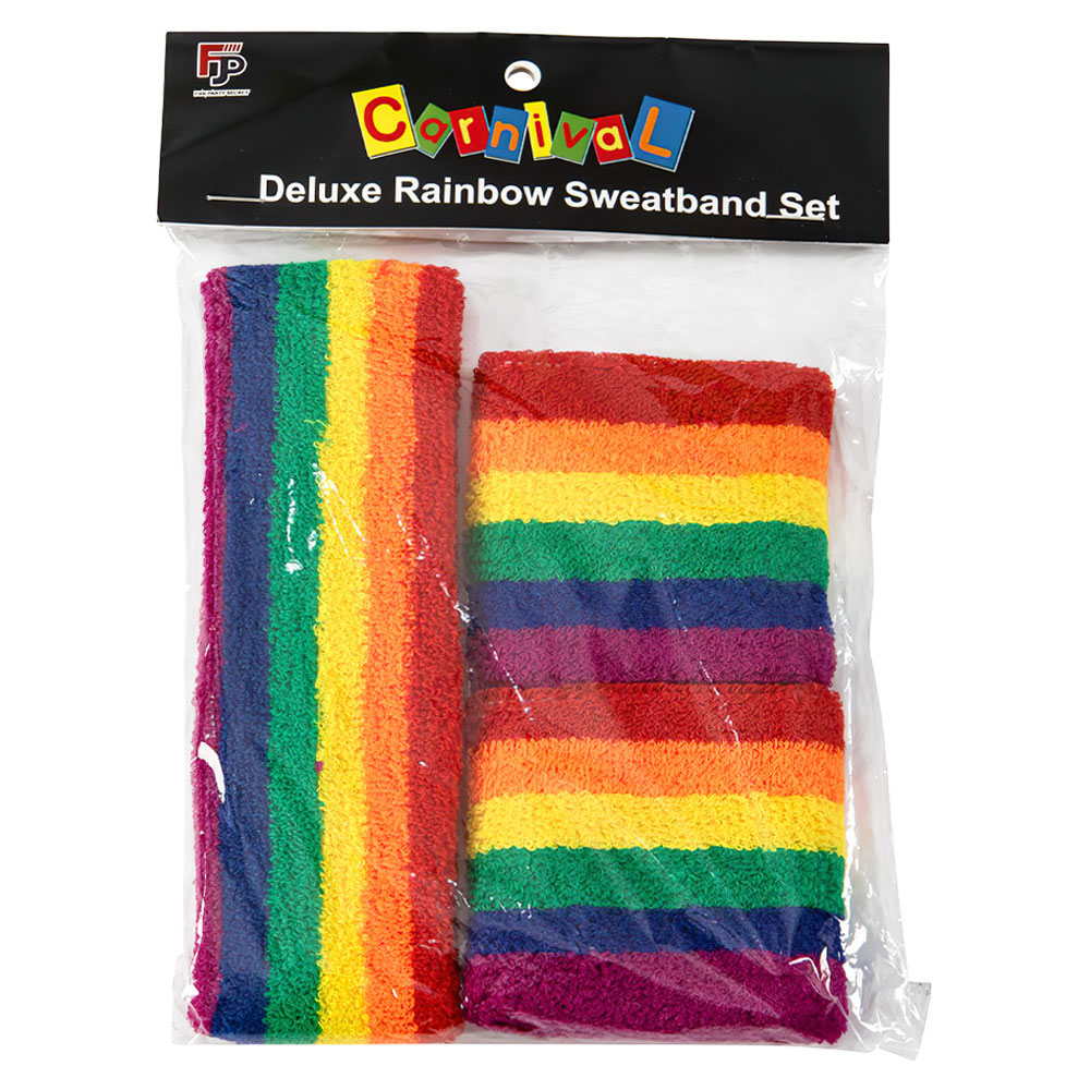 Pannband med Svettband Regnbåge Pride omfattar ett set med två randiga svettband och ett randigt pannband i regnbågens färger. Banden är tillverkade av polyester och kommer i one size.