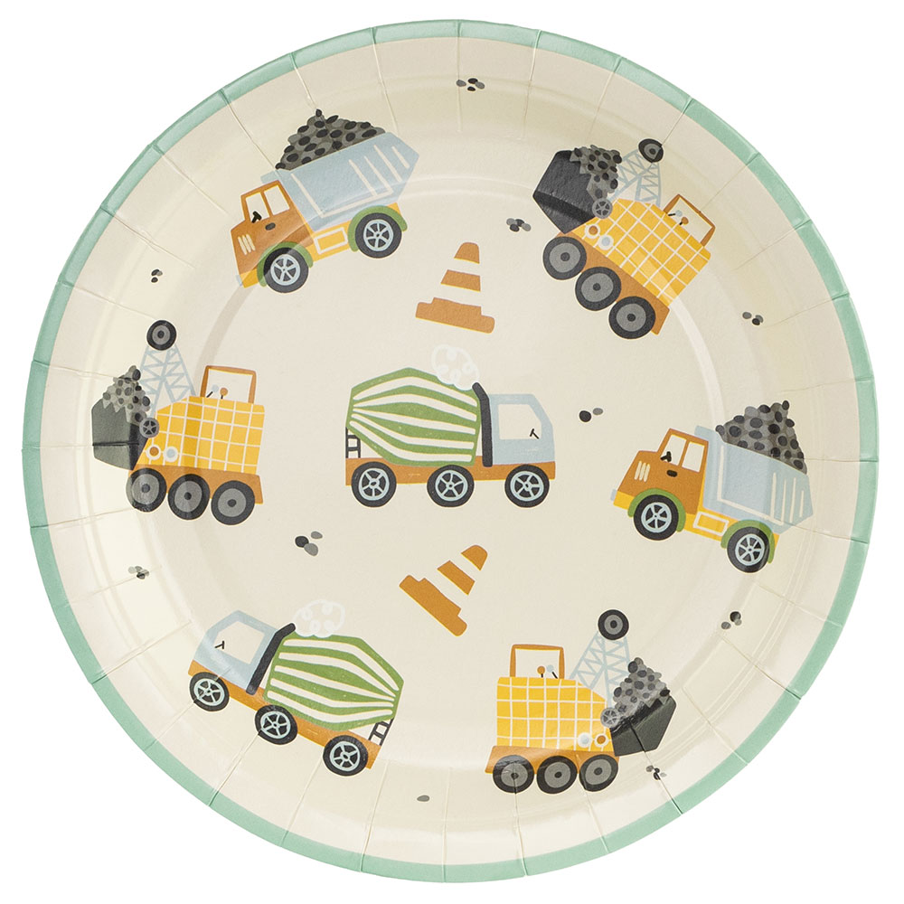 Pappassietter Byggfordon omfattar sex stycken vita engångsassietter med turkos kant och motiv av flera byggfordon i arbete.