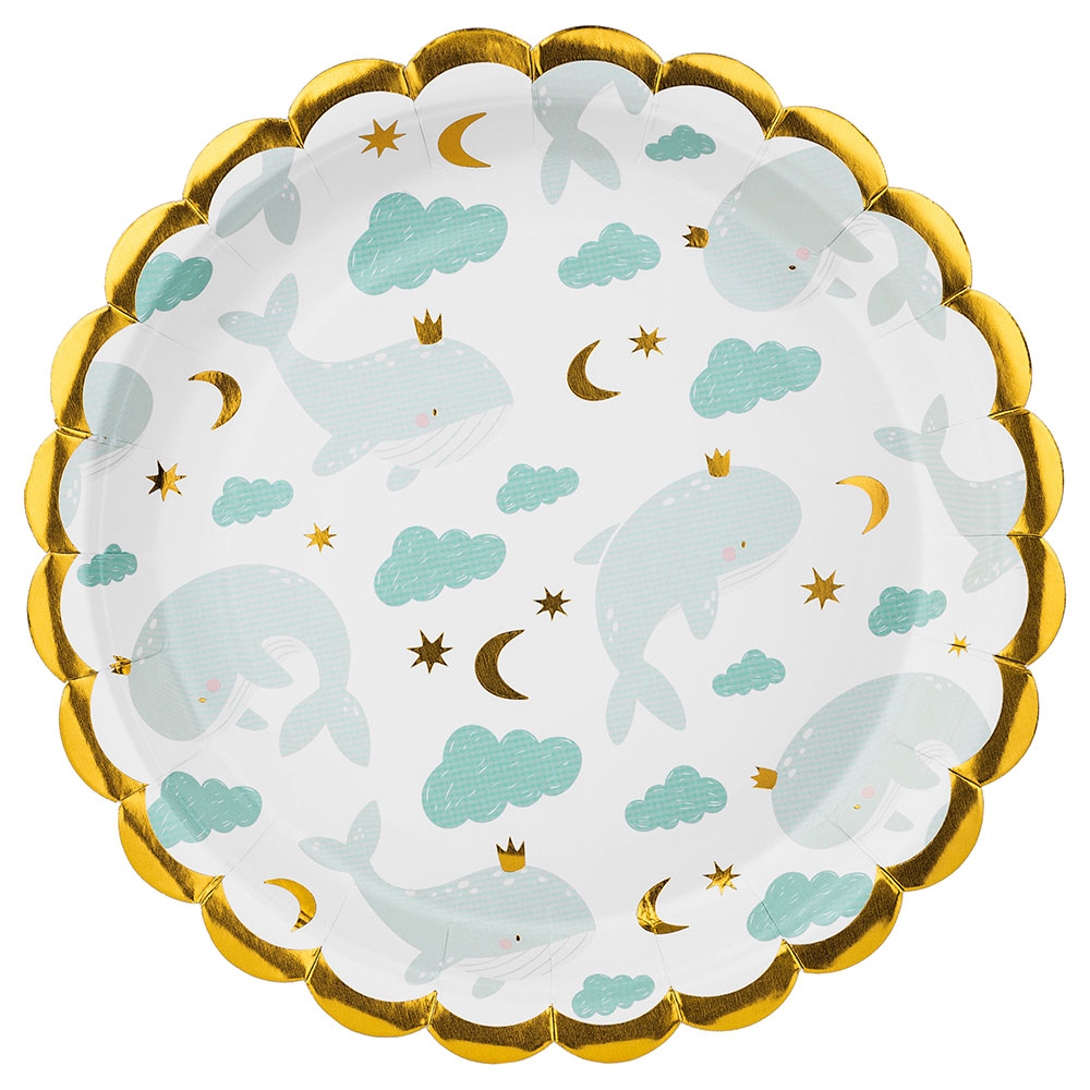 Pappassietter Valar omfattar sex stycken vita pappassietter med en guldkant och fina blå val- och molnmotiv samt guldiga månar och stjärnor.