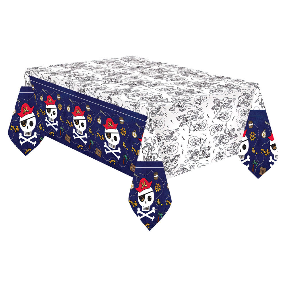 Pappduk Pirates Map omfattar en vit engångsduk med mörkblåa kanter och motiv av en skattkarta samt piratdödskallar längst kanten. Duken är tillverkad av papp och är ca 120 x 180 cm stor.