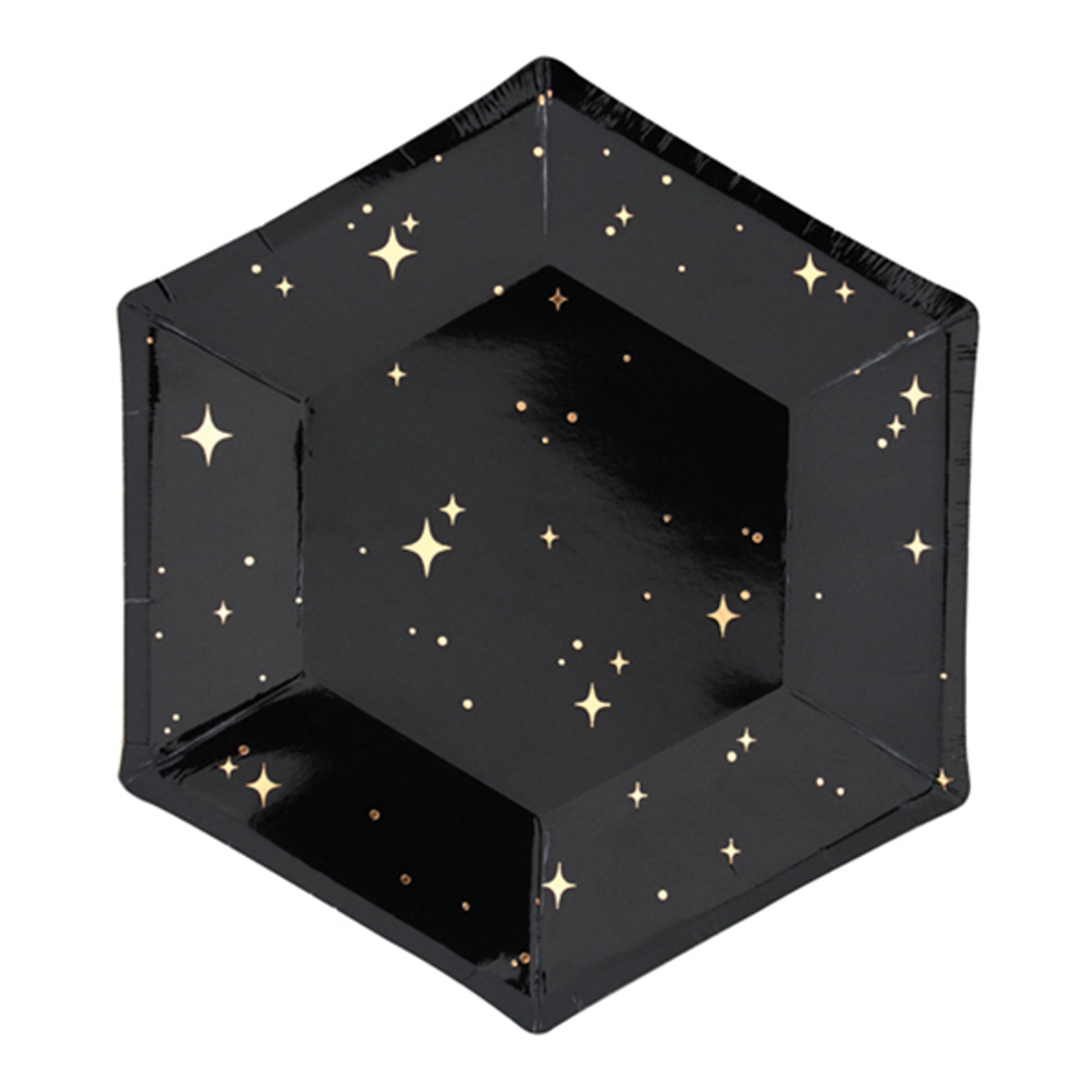Pappersassietter Guldstjärnor Hexagon Celebrate levereras som ett 6-pack, mäter 20 cm stora och är tillverkade i papp. Fungerar lika bra till julen som till födelsedagsfesten eller till nyår.