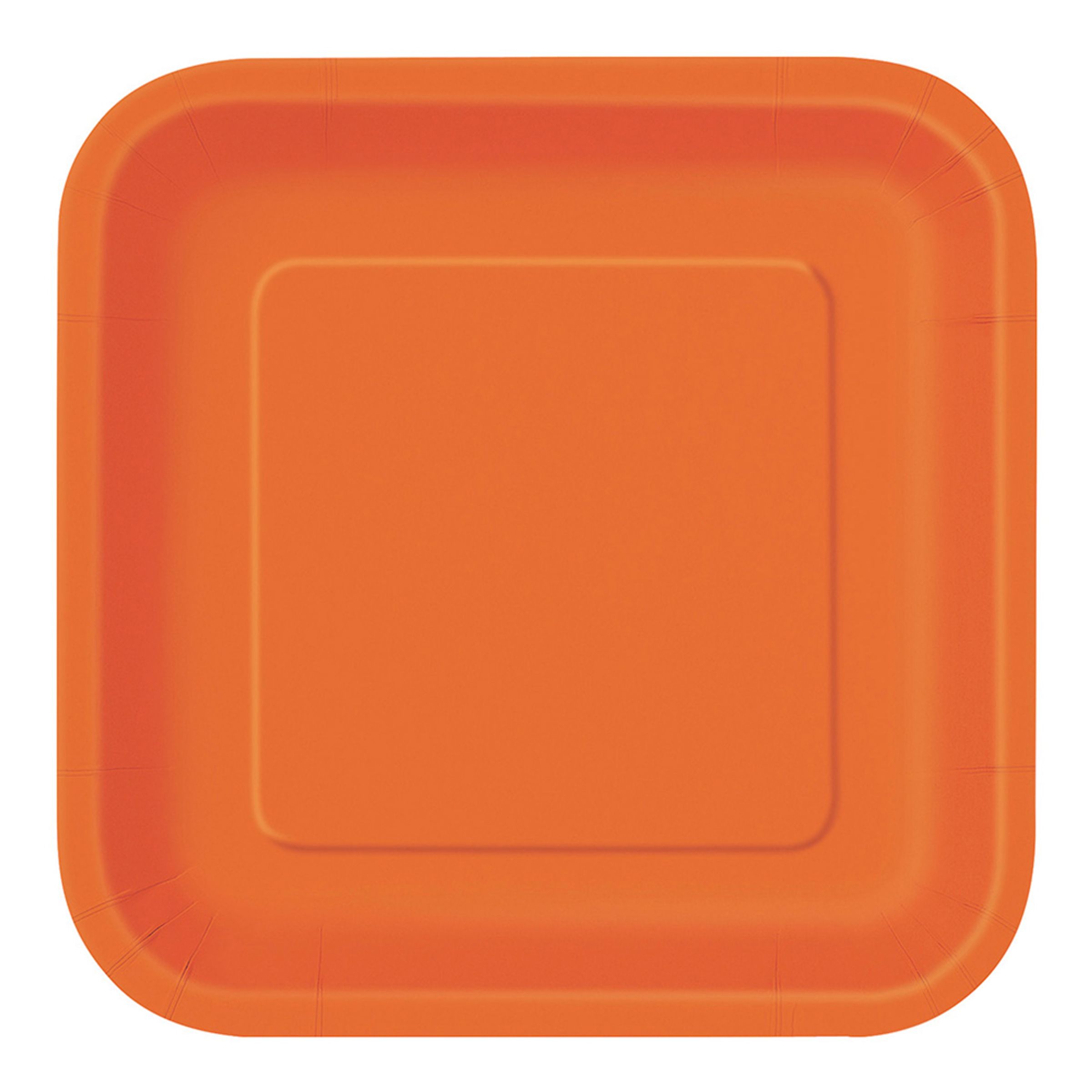 Pappersassietter Kvadrat Orange är assietter i papp som går helt i orange. Assietterna har formen av kvadrater med rundade hörn.