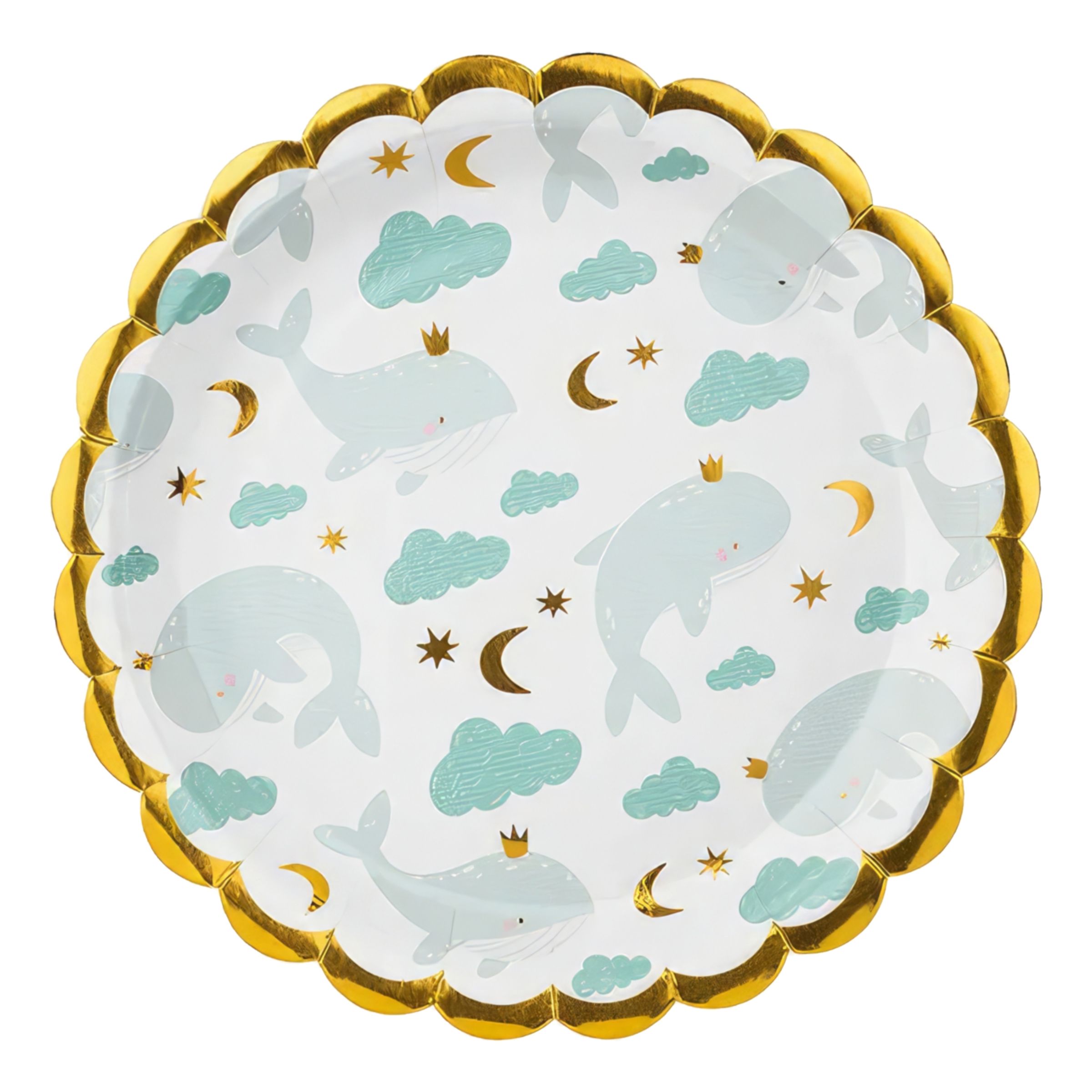 Pappersassietter Valar inkluderar sex stycken papperstallrikar som kommer med ett ljusblått motiv föreställande valar och moln. Assietterna kommer dessutom med guldfärgade detaljer och skimrande kanter.