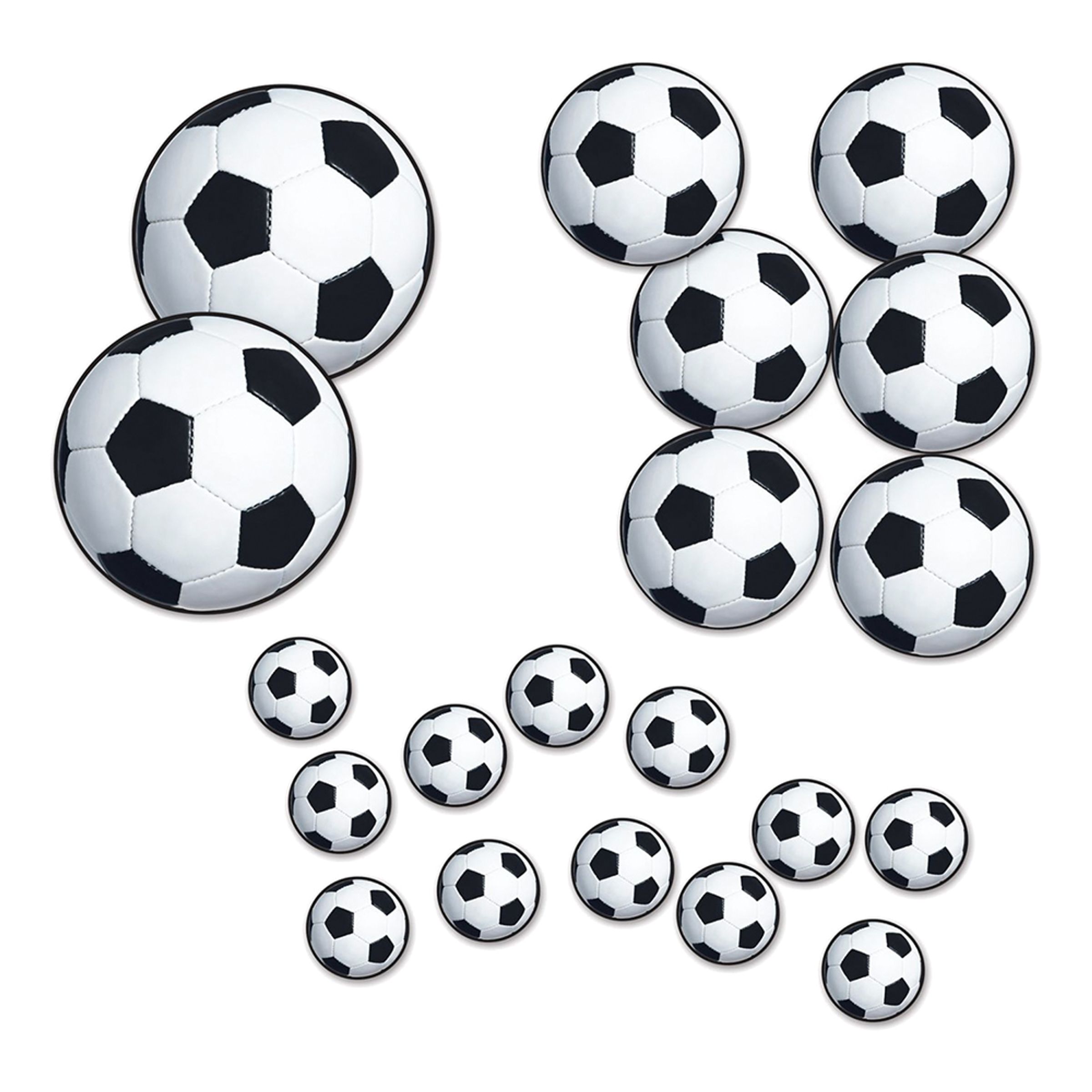 Pappersdekorationer Fotbollar inkluderar 20 stycken dekorationer i papp. Dekorationerna är formade som fotbollar i svart och vitt och de kommer i varierande storlekar från ca 5 cm och upp till ca 30 cm.