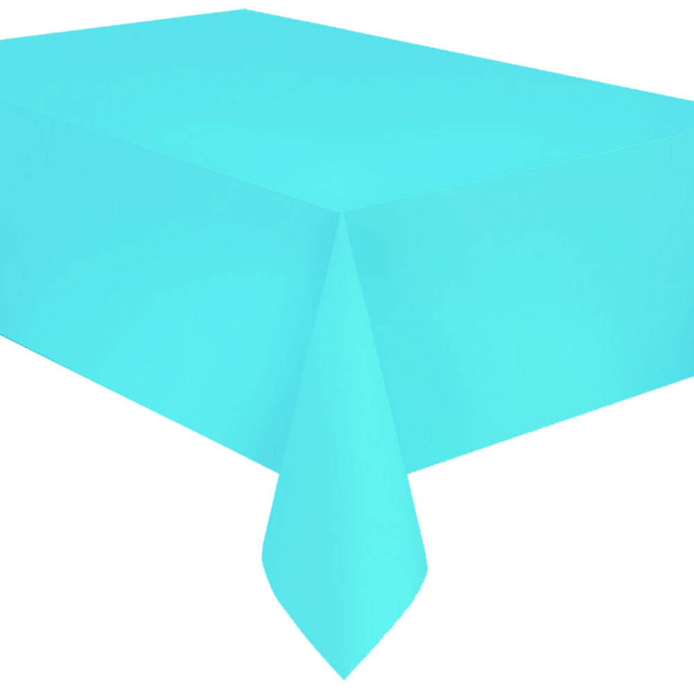 Pappersduk Caribbean omfattar en ljusblå bordsduk i papper. Bordsduken kan antingen användas till ett långt bord eller delas i två delar för att användas till två fyrkantiga bord.