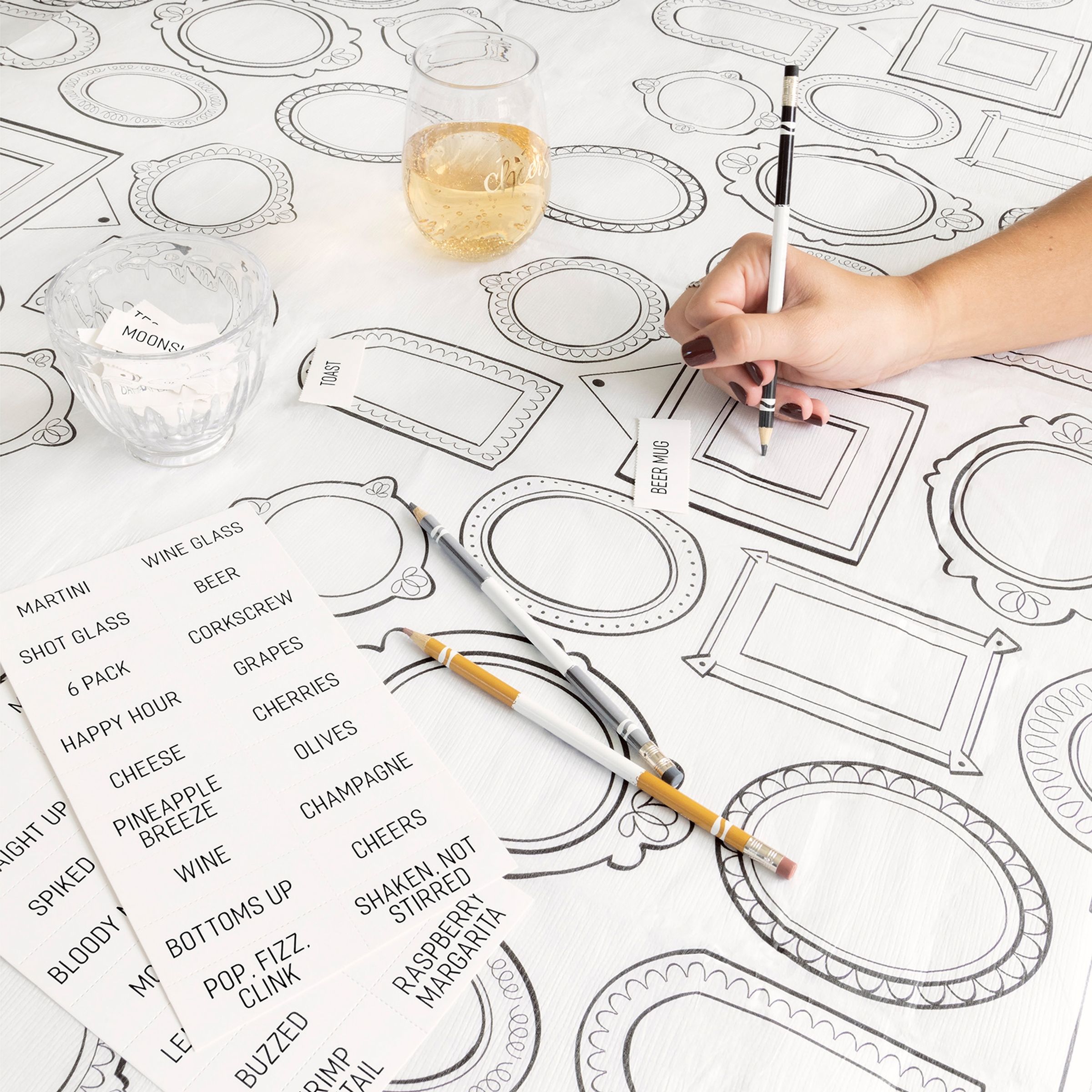 Aktivera middagsgästerna med denna fantastiska duk. Duken är fylld med ramar i olika utföranden, vilket gör att du kan låta gästerna måla varsitt porträtt när dom väntar på maten.