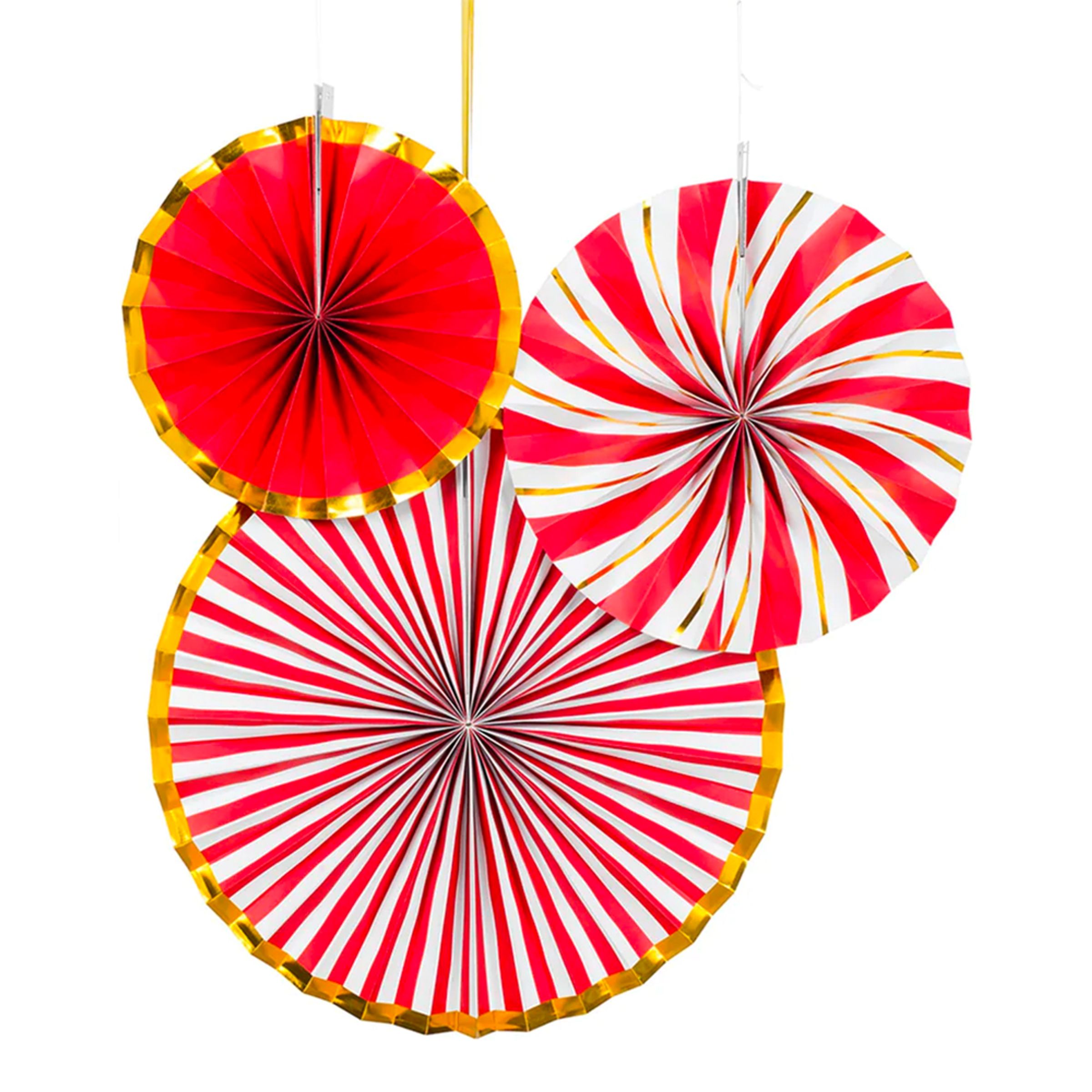 Pappersfjädrar Röd/Vit Randiga består av tre runda pappersdekorationer i röda och vita färger med guldfärgade linjer och kanter i lekfulla mönster. Dekorationerna är i tre olika storlekar och levereras med snören för smidig upphängning. Matcha gärna med resterande artiklar i samma kollektion. Passar lika bra till jul som till cirkuskalaset!