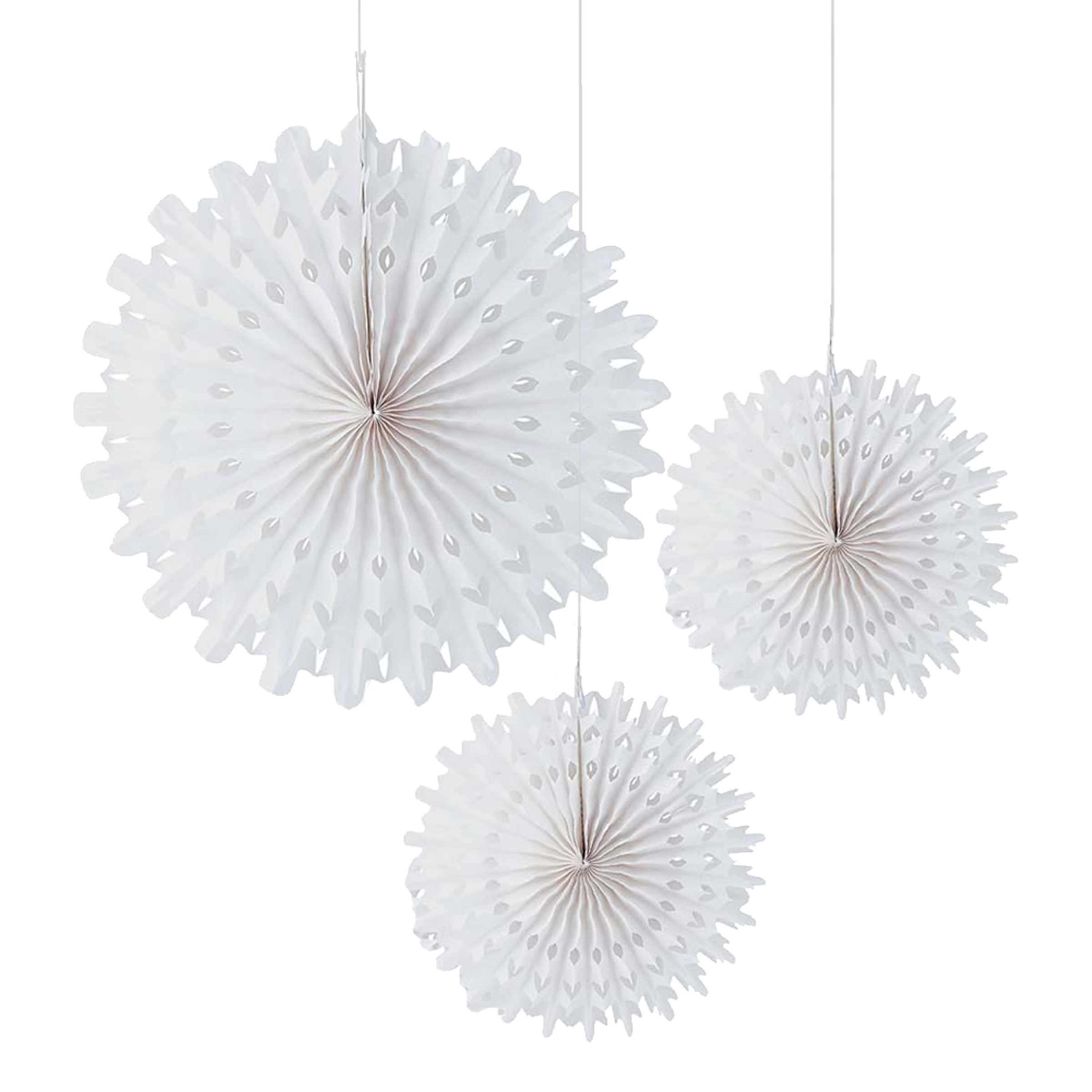 Pappersfjädrar Snöflingor Hängande Dekoration är tre stycken vita pappersdekorationer, en stor och två mindre, som ser ut som puffiga snöflingor. Häng upp dom vid fönstret eller på annat passande ställe i hemmet för extra mysig julstämning!