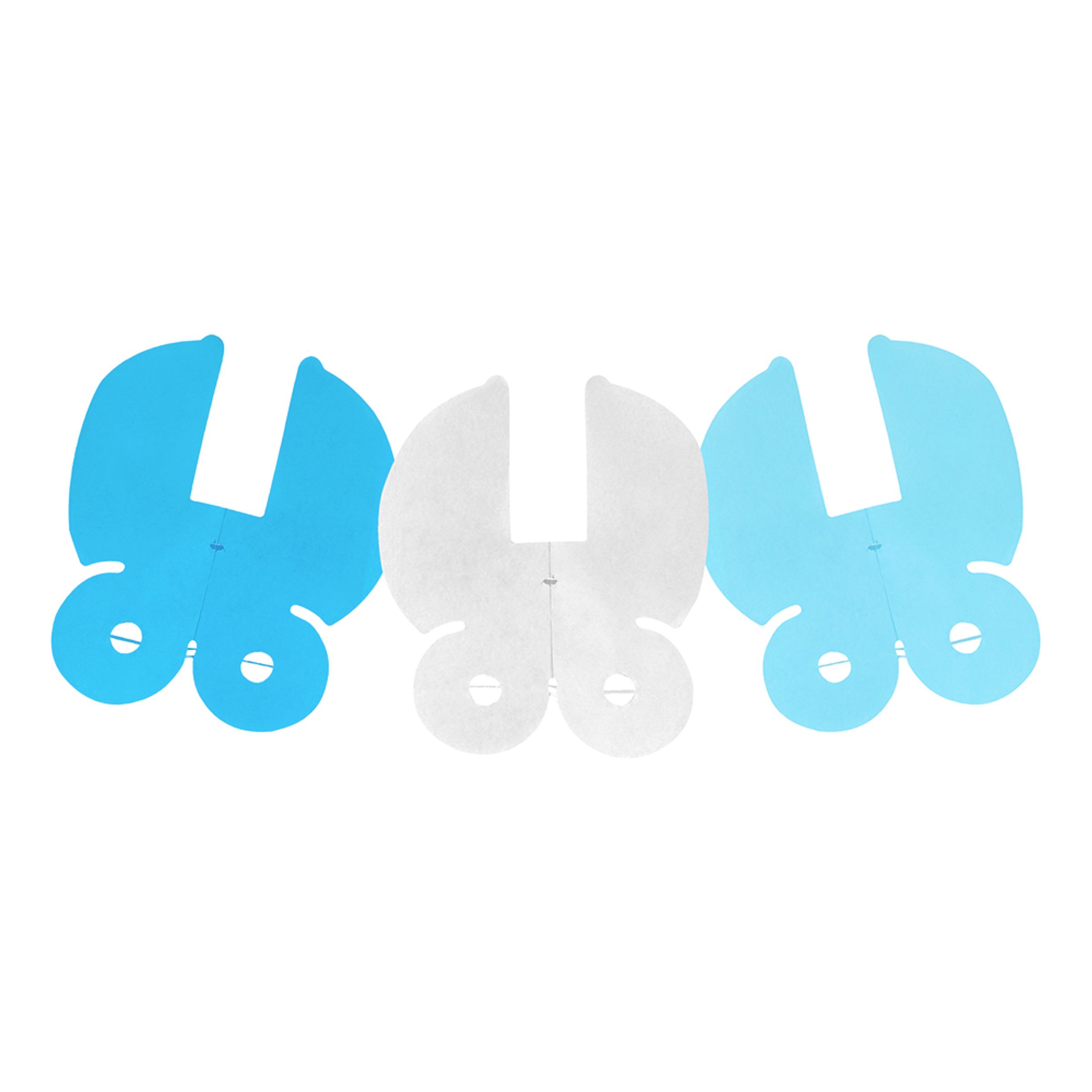 Pappersgirlang Barnvagnar Blåmix är en 2,6 meter lång girlang tillverkad i blått och vitt papper. Pappersdekorationerna ser ut som små barnvagnar. Girlangen är enkel att hänga upp med till exempel lite tejp.