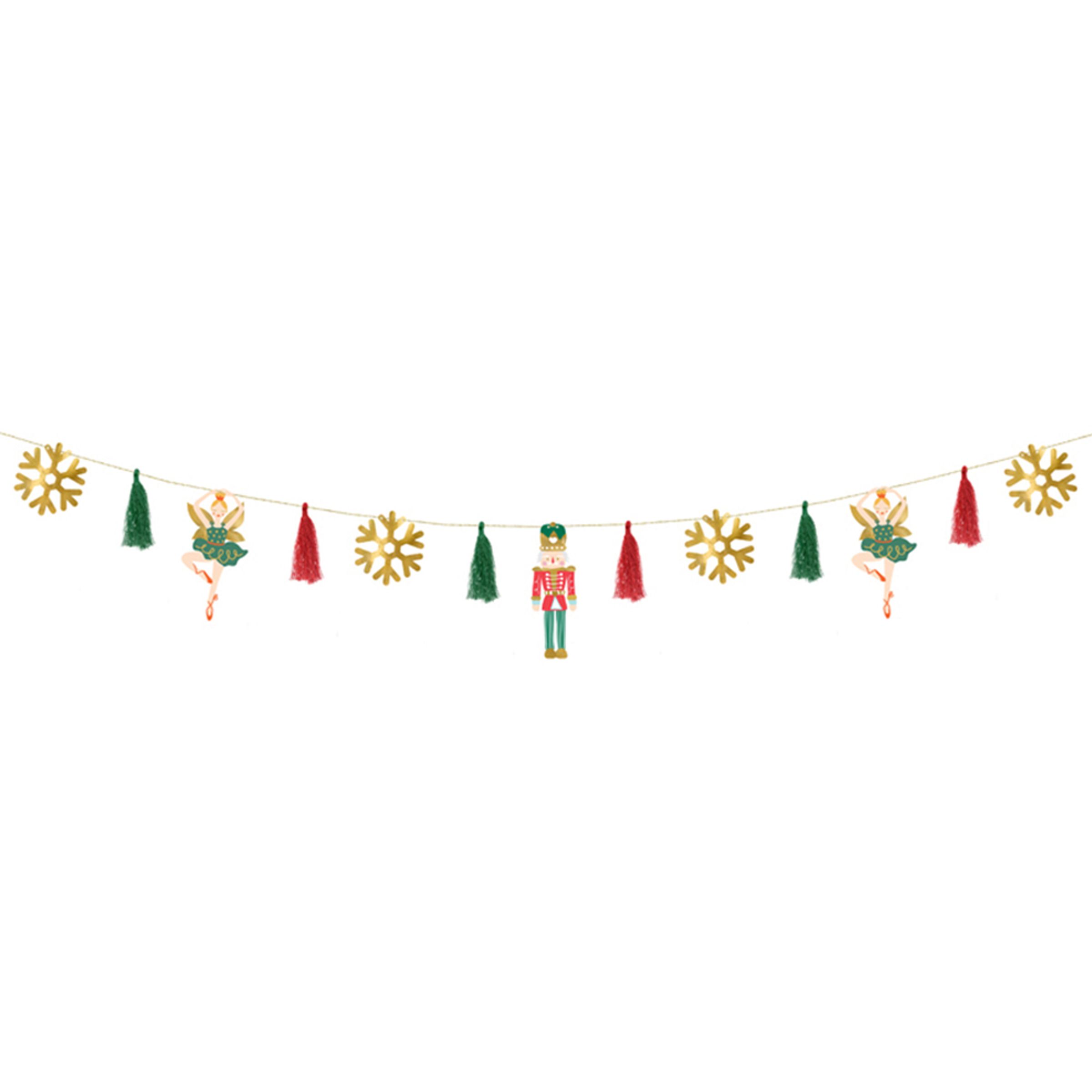 Vacker girlang dekorerad med nötknäppare, tassels i olika färger och älvor. En enkel, men väldigt mysig juldekoration till både vardagsrum och sovrum.