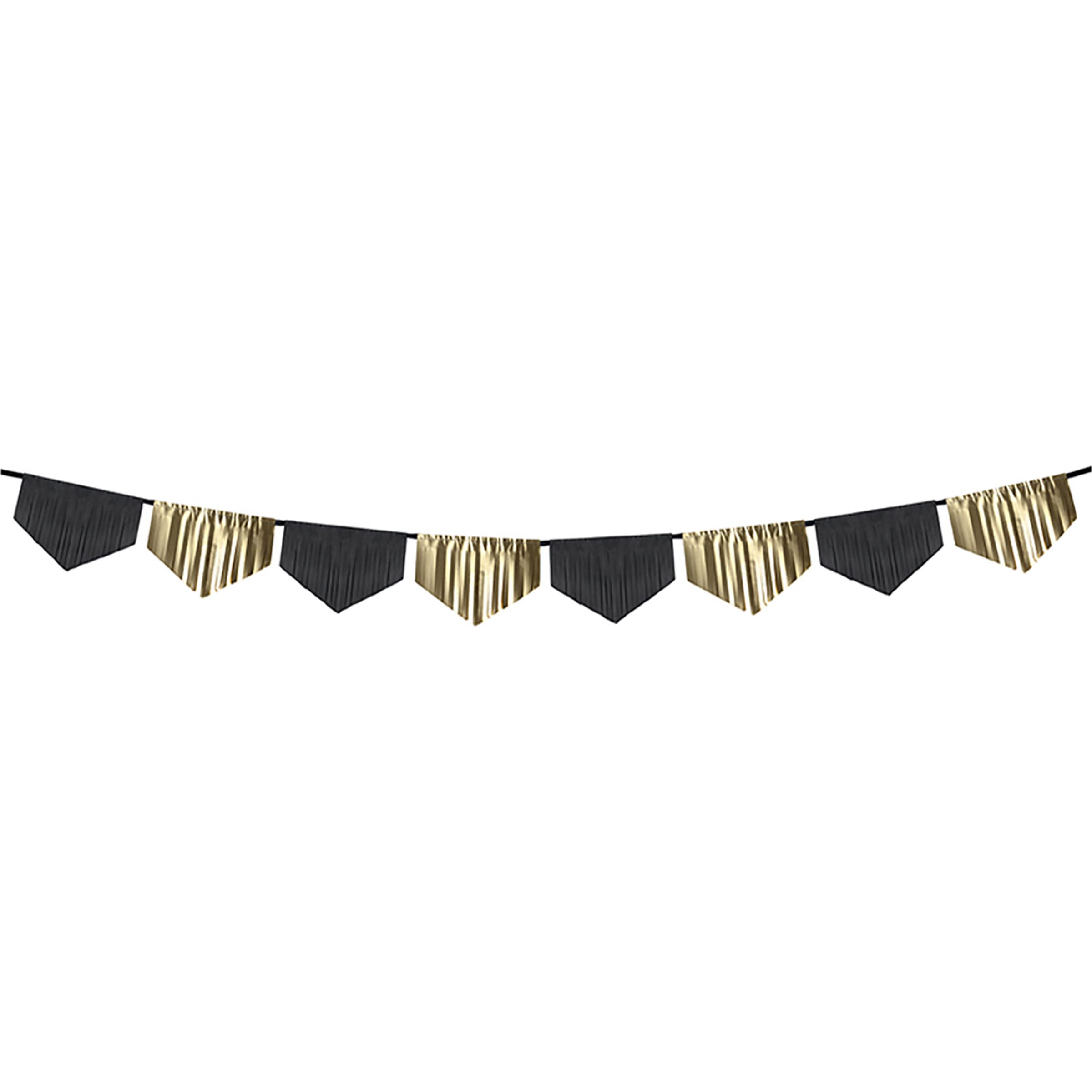 Pappersgirlang Svart/Guld är en fin girlang fylld med skimrande vimplar i svart och guld. Girlangen hängs enkelt upp med en bit tejp eller liknande.