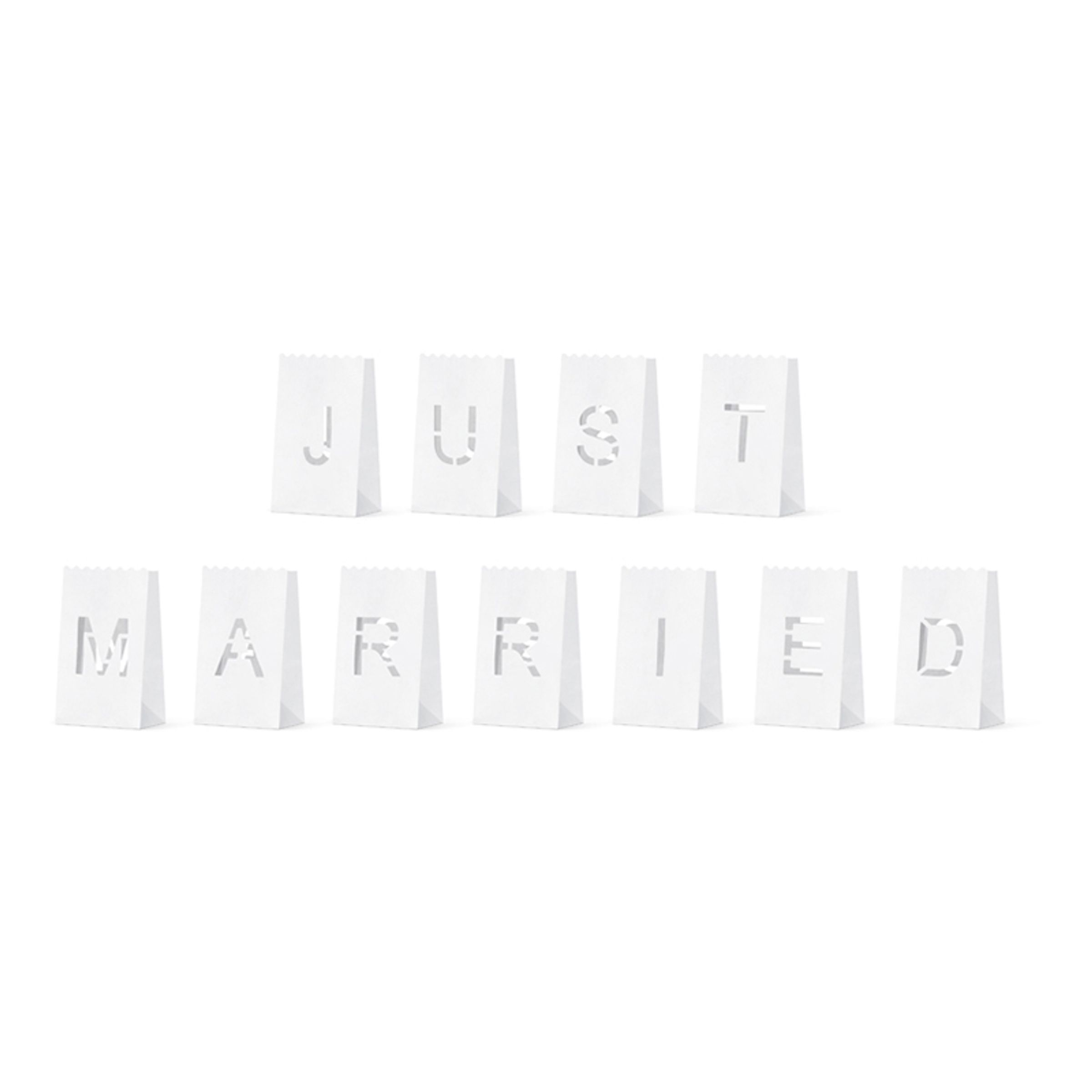Papperslyktor Just Married består av 11 stycken lyktor för ljus i form av påsar med utklippta bokstäver som skapar inskriften ''Just married''. Lyktorna mäter ca 11,5 x 19 x 7 cm och är tillverkad av icke brandfarligt papper.