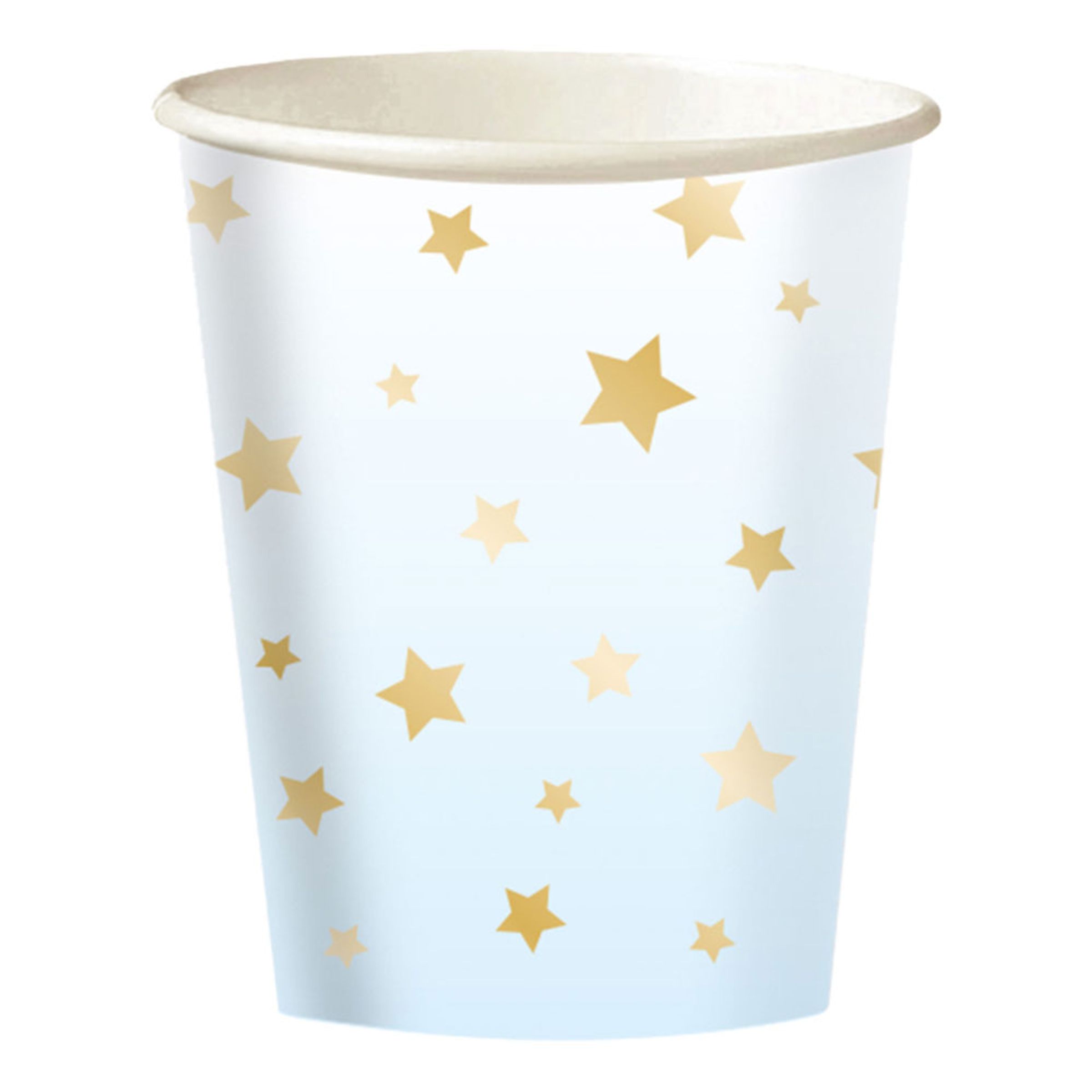 Pappersmuggar 1st Birthday Blå är ljusblå pappmuggar tryckta med guldfärgade stjärnor. Köp till resterande dukningsprylar ur samma kollektion för en enhetlig dukning!