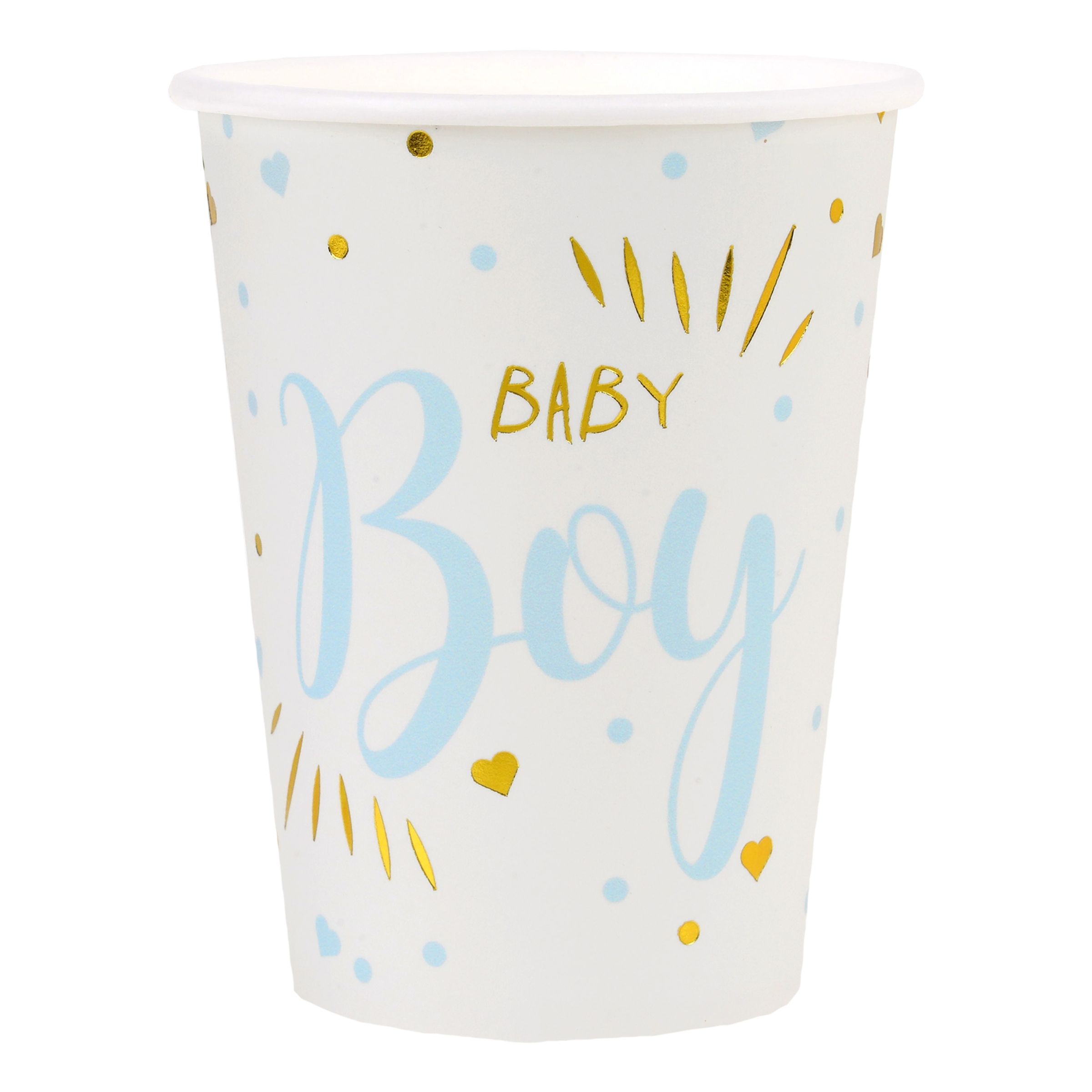 Pappersmuggar Baby Boy är ett gäng supergulliga muggar som gästerna kan förtära dryck i. Pappersmuggarna är vita med detaljer i blått och guld med texten "Baby Boy". Passar perfekt till baby showern eller 1-års kalaset.