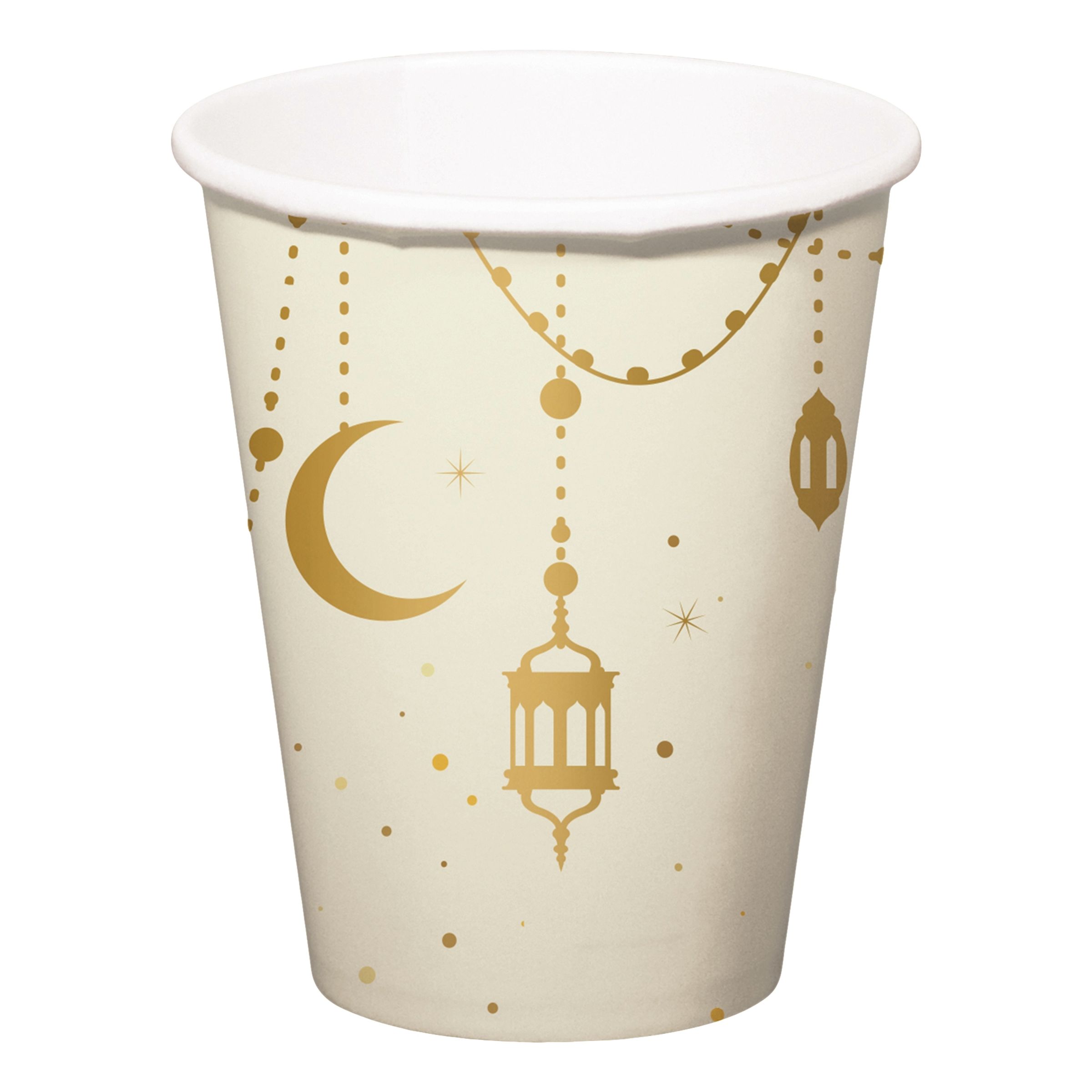 Pappersmuggar Eid Mubarak inkluderar åtta stycken vita engångsmuggar som kommer med ett guldfärgat Eid-motiv. Muggarna är tillverkade av FSC-certifierat papper och passar utmärkt att matcha med annan dukning ur samma serie.