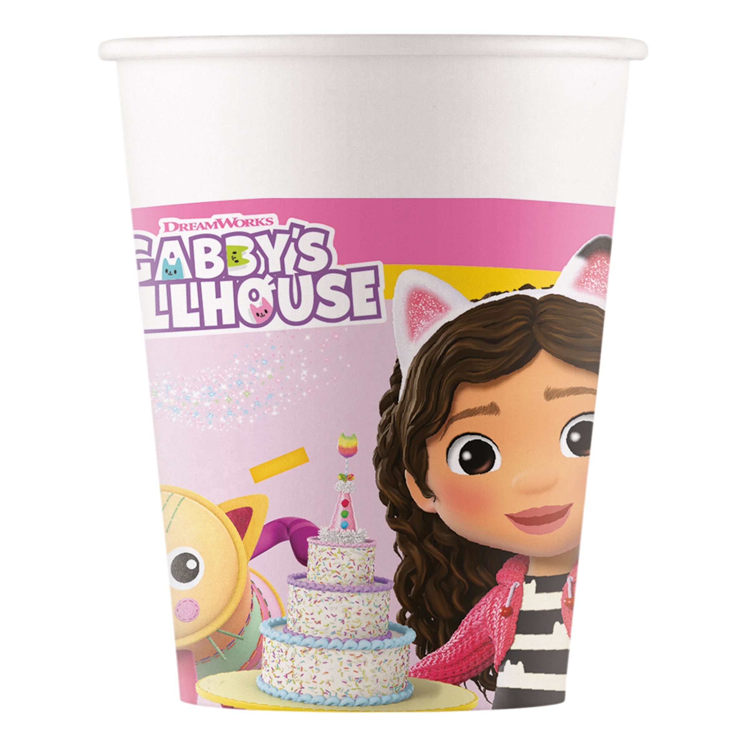 Pappersmuggar Gabbys Dockskåp inkluderar åtta styckna pappersmuggar i färgen rosa och har motivet av Gabby från barnprogramet Gabbys Dockskåp. Perfekta till ett barnkalas!